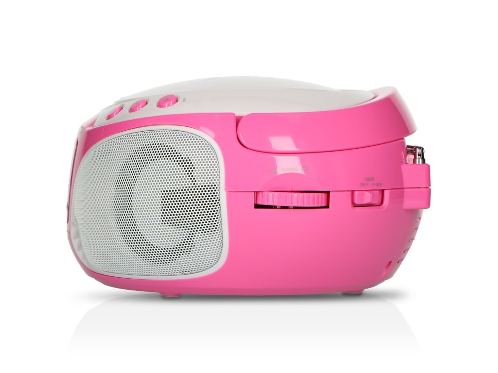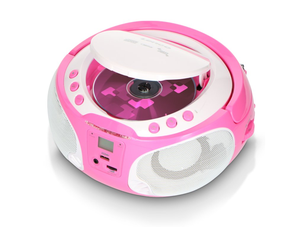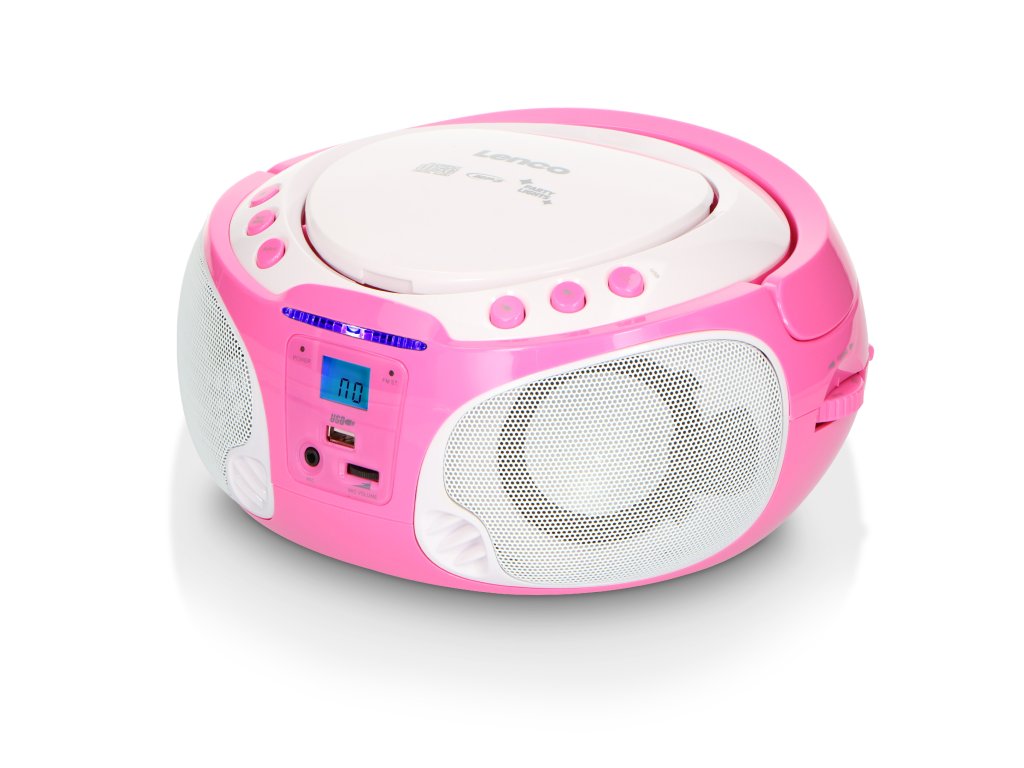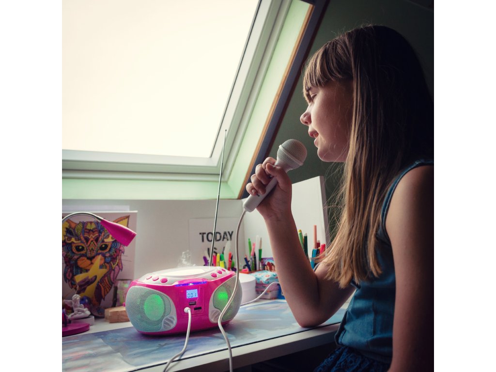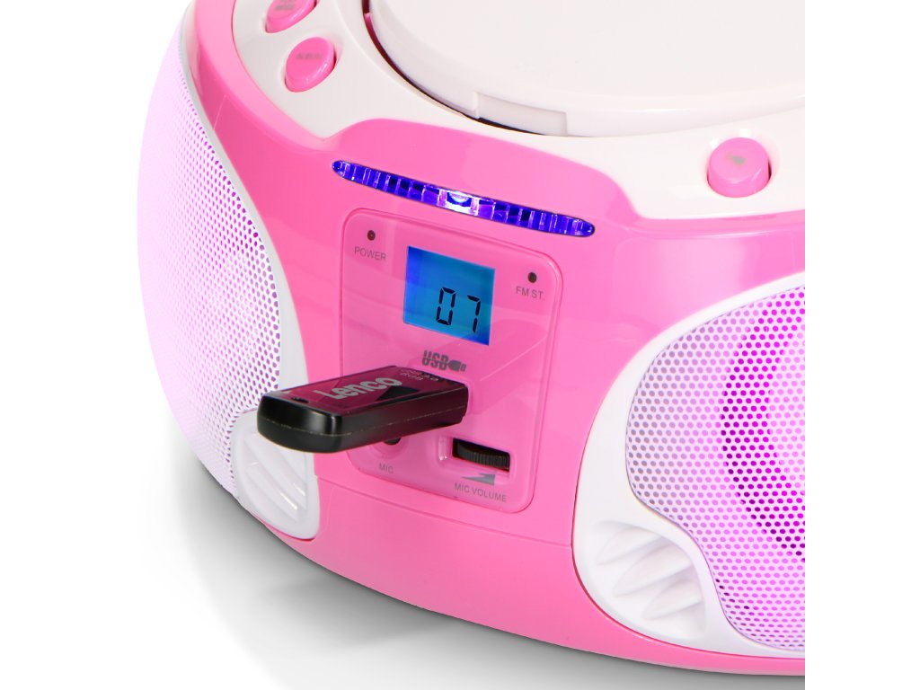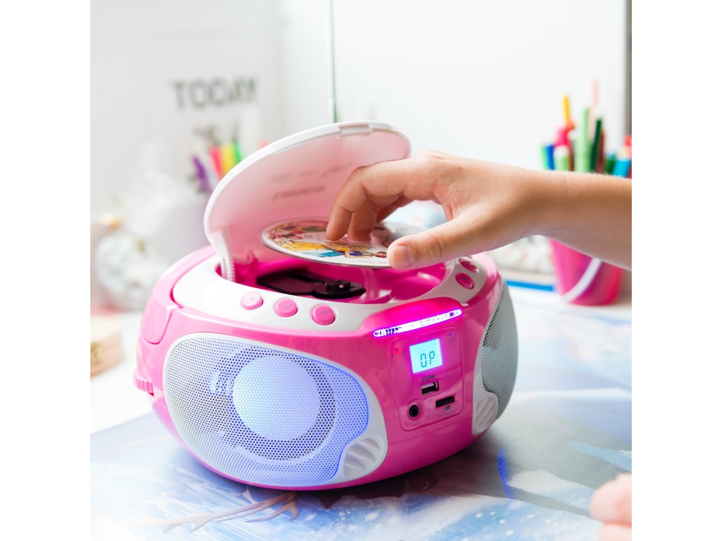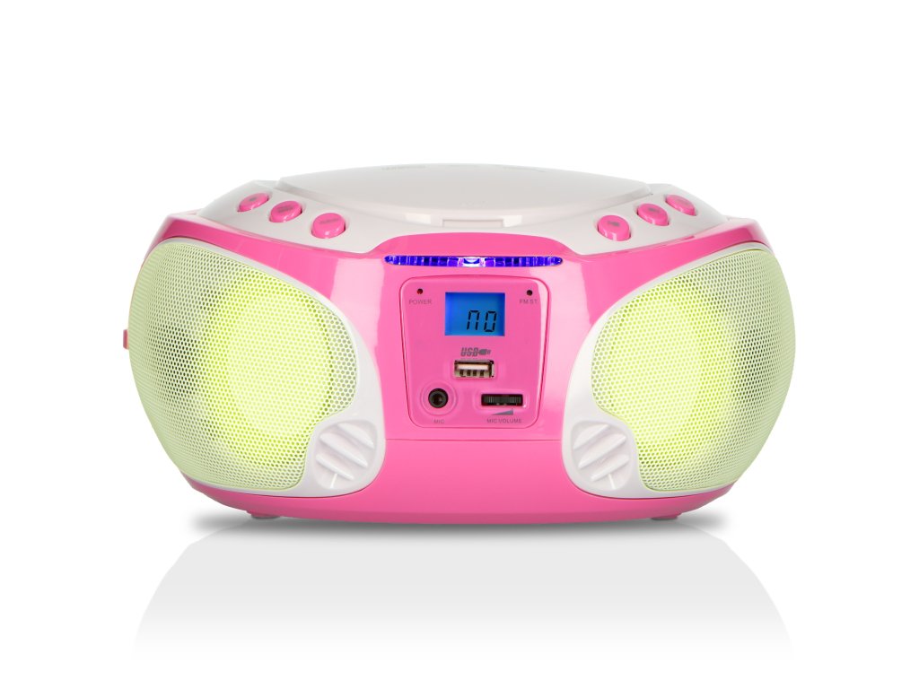 Přenosné FM rádio CD/MP3/USB Mikrofon a světelné efekty Růžová barva
