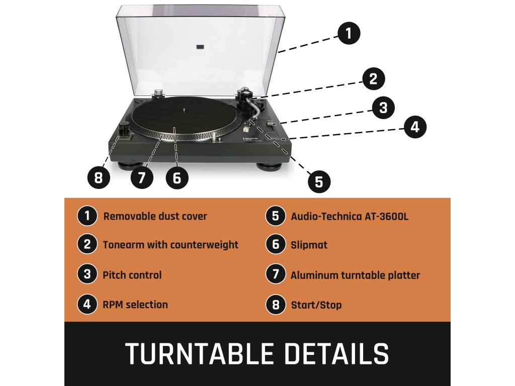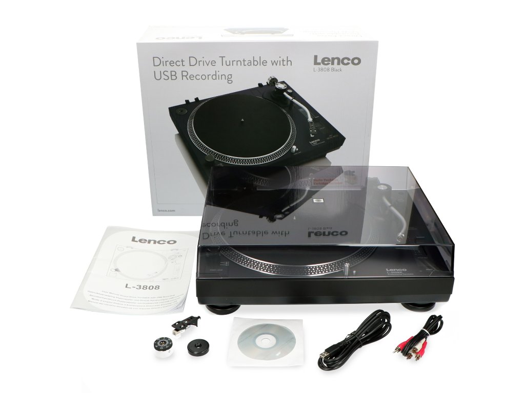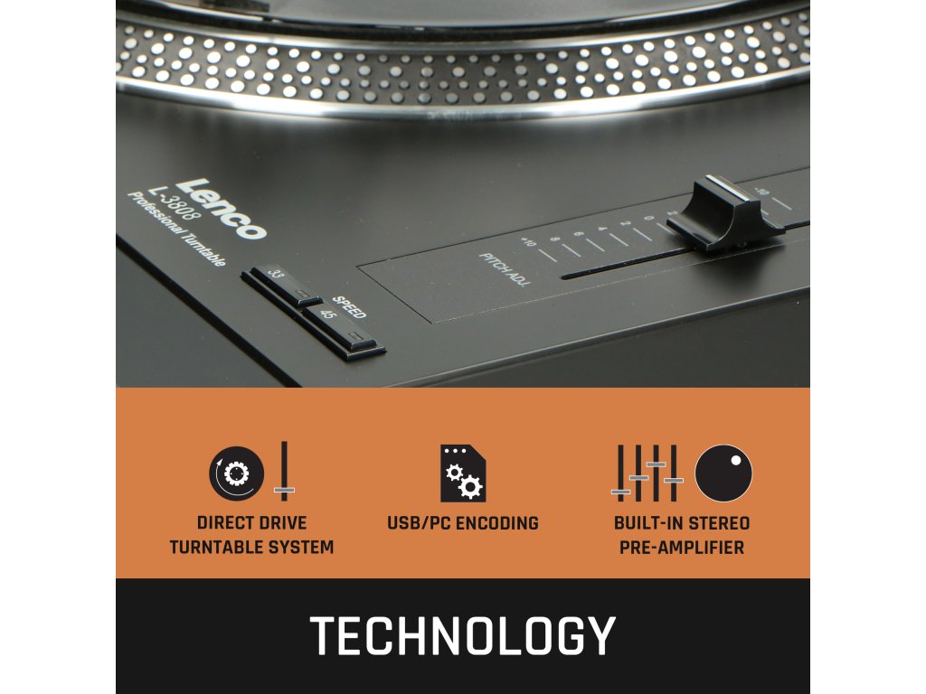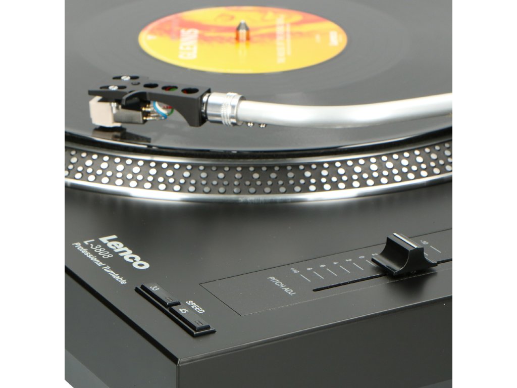 Lenco L-3808 je vysoce kvalitní profesionální gramofon s přímým pohonem, který je vhodný zejména pro DJe. Přímý pohon zaručuje okamžité spuštění desky nazývané také "rychlý start" Gramofon je vybaven osvětlením pro optimální pohodlí při obsluze a stroboskopem. Rychlost gramofonu snadno nastavíte pomocí variabilního pitch faderu. Díky vestavěnému gramofonovému předzesilovači můžete Lenco L-3808 připojit přímo k mixážnímu pultu nebo stereofonnímu systému. S přehrávačem Lenco L-3808 si můžete své vinylové desky uchovat navždy díky jejich digitalizaci do počítače. Své vinylové desky můžete snadno převést na digitální album pomocí kabelu USB, a tak si můžete vždy vychutnat svou oblíbenou hudbu, ať jste kdekoli. Odnímatelný plastový kryt proti prachu chrání přehrávač před prachem. Díky atraktivnímu a nadčasovému vzhledu se přehrávač Lenco L-3808 hodí do každého interiéru a zároveň vám umožní vychutnat si klasický zvuk. Gramofon Lenco L-3808 je k dispozici ve třech barvách: bílé, černé a matně šedé.