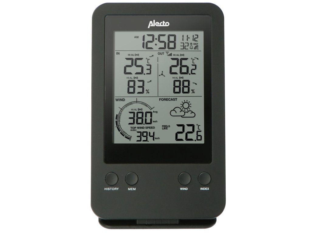 • Vysoce kvalitní meteorologická stanice pro vnitřní i venkovní použití • Meteostanice Alecto WS-3400 pro vnitřní i venkovní použití • Měřič rychlosti větruVnitřní a venkovní teplota • Vždy správný čas (řízeno DCF) • "Pocitová" teplota • Vnitřní a venkovní vlhkost vzduchu • Paměť nejnižších a nejvyšších naměřených hodnot • Funkce alarmu / výstrahy • Šance na vyhlazení displeje • Jantarové podsvícení • Vhodné i pro montáž na stěnu Už žádné překvapení S touto vysoce kvalitní meteorologickou stanicí WS-3400 s venkovním senzorem vás už nikdy nečekají překvapení v každodenním počasí. Budete mít přehled o místním počasí v kteroukoli denní dobu a tato vysoce kvalitní meteostanice má také vše, co potřebujete pro dobrou místní předpověď počasí. Meteostanice například měří rychlost větru, vnitřní a venkovní teplotu a vlhkost vzduchu pro vnitřní i venkovní prostory. Dodávaná venkovní jednotka se bezdrátově připojuje k vnitřní jednotce a samostatně měří teplotu, vlhkost a rychlost větru venku. Všechny informace na první pohled Meteostanice Alecto WS-3400 má přehledný 5,5" displej, který na první pohled zobrazuje všechna přesná měření. Kromě toho vám meteostanice poskytuje informace o čase, datu, upozornění na počasí, síle signálu venkovní stanice, síle baterie a předpovědi počasí na příštích 24-72 hodin. Jantarové podsvícení zajišťuje jasnou a snadno čitelnou obrazovku. Meteostanice je vhodná k montáži na stěnu, ale díky dodávanému stojánku může být užitečná i na jiném praktickém místě v domě. Kompaktní design této kvalitní meteostanice se hodí do každého interiéru. Vždy užitečné Tato kvalitní meteostanice nabízí mnoho dalších funkcí, nejen měření teploty. V mnoha situacích je užitečné vědět, jaké je nebo bude počasí. Máte v neděli vyjížďku na kole? Pak je síla větru cennou informací. Než nasednete do auta, automaticky obdržíte upozornění na mrznoucí déšť nebo kluzké podmínky. S meteostanicí WS-3400 máte vše, co potřebujete, abyste se stali nejlepším předpovědníkem počasí v okolí! Co je součástí balení? • Vnitřní jednotka meteorologické stanice (obrazovka) • Venkovní jednotka meteorologické stanice (čidlo) • Montážní materiál • Příručka NL / EN / DE / FR • Univerzální příručka