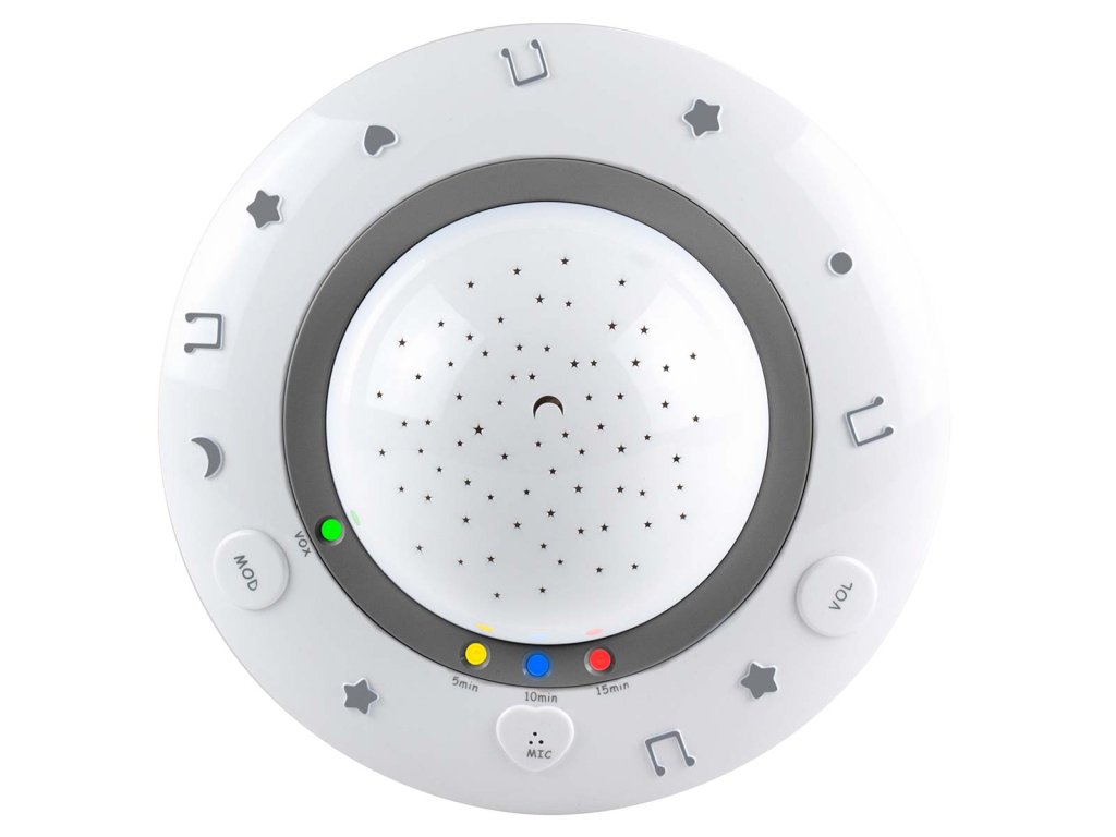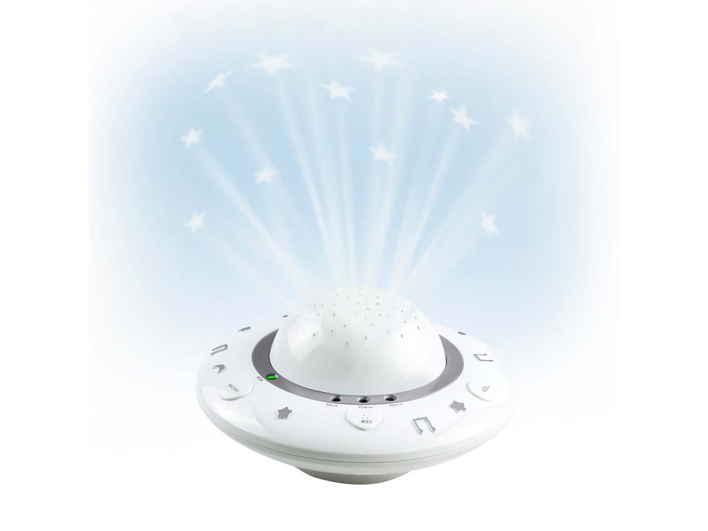 Usínejte s dudlíkem BC-125 GS, nočním světlem pro děti. Stejně jako všechny malé děti je vaše dítě fascinováno obrazem a zvukem s jemnou hudbou a krásnými obrázky. Svému dítěti můžete nabídnout pohodlí a klid. BC-125GS je stylový dudlík na spaní a projektor, který umožňuje promítat krásné a barevné obrázky na strop dětského pokoje, zatímco v pozadí zní tiché ukolébavky. Usínání se stane pravidelným zvykem Výhody dudlíku na spaní BC-125GS: • Napájení na baterie, takže dudlík na spaní můžete umístit na vhodné místo. • Ovládání hlasitosti, takže můžete nastavit hlasitost ukolébavek podle potřeb dítěte. Dudlík na spaní reaguje na zvuk Jakmile dudlík na spaní zapnete, začne promítat obrázky a přehrávat hudbu. Usíná vaše dítě snadno a rychle? Pak zvolte pro dudlík hraní v délce pěti minut. V případě potřeby můžete zvolit i deset nebo patnáct minut. Když dudlík přestane hrát, většina malých dětí již tvrdě spí. Pokud se vaše dítě po této době probudí, dudlík BC-125GS to vycítí a automaticky začne znovu hrát. Dudlík na spaní, projektor nočního světla pro děti od přední společnosti na trhu Alecto, která je držitelem ocenění, pokud jde o dětské chůvičky, s více než 45 lety zkušeností v oblasti dětských výrobků. Při vývoji tohoto dudlíku jsme využili naše rozsáhlé odborné znalosti při vývoji dětských chůviček. Model BC-125GS je vybaven funkcí přehrávání ukolébavek, která automaticky reaguje na zvuk a kterou disponují naše oceňované dětské chůvičky. Dudlík BC-125GS Sleep byl vyvinut a testován v našich vlastních výzkumných a vývojových zařízeních v Nizozemsku. Se společností Alecto si vybíráte promyšlený a uživatelsky přívětivý výrobek vysoké kvality. Co je součástí balení? • Dudlík na spaní, projektor nočního světla pro miminka. • Návod k použití NL / EN / DE / FR / IT