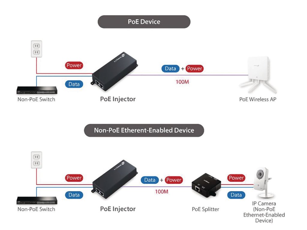 Injector GP-101IT umožnuje současně přenos dat i napájení zařízení schodně se standardy 802.3af/at za pomoci kabelů Ethernet. To umožnuje snadnější budování infrastruktury zařízení PoE bez potřeby zakoupení dodatečného PoE switche. Standard 802.3at/af Power over Ethernet Použití GP-101IT umožnuje připojit do routeru nebo switche nepodporujícího PoE zařízení napájené přes PoE, jako jsou síťové kamery, přístupové body, nebo telefony VoIP. Úspora a snadná instalace Technologie Power over Ethernet umožnuje přenos dat a napájení pomocí jednoho přívodního kabelu Ethernet. Díky GP-101IT již není potřeba instalovat zásuvky nebo elektrické dráty k napájení síťových zařízení jako jsou například kamery nebo přístupové body což zjednodušuje instalaci a zmenšuje náklady. Spolehlivost Injector GP-101IT je vybavený pojistkou proti zkratu, čímž chrání připojené zařízení před poškozením