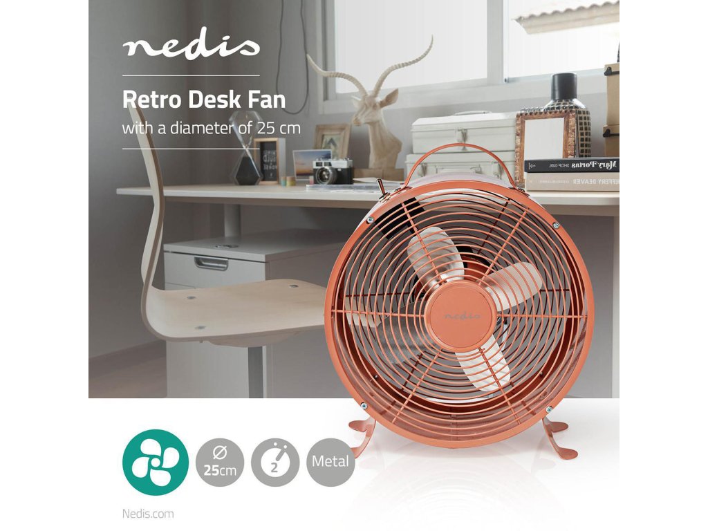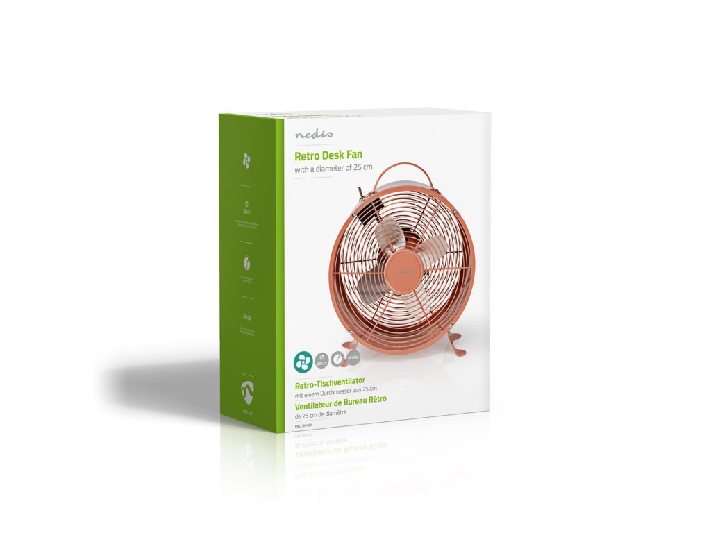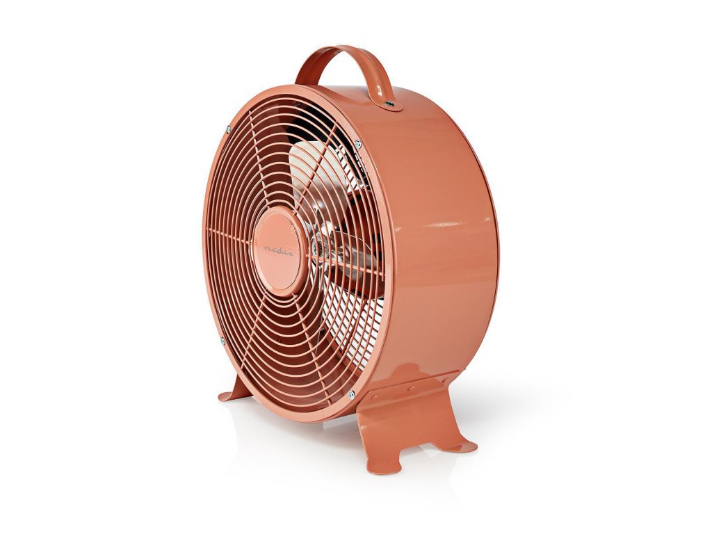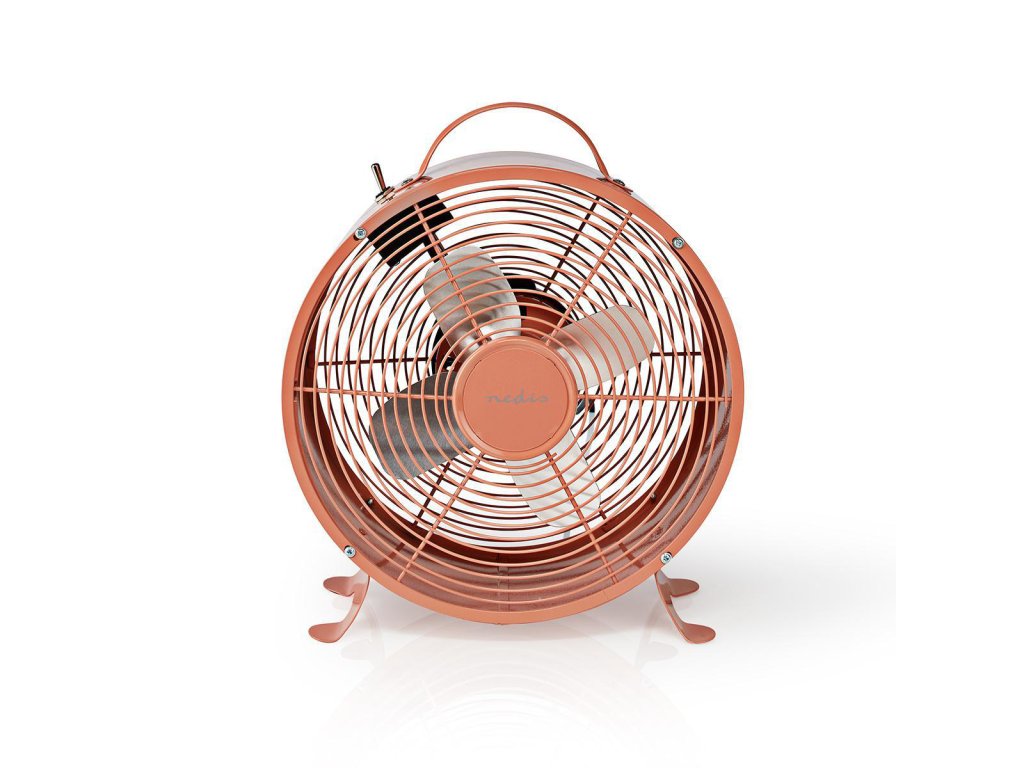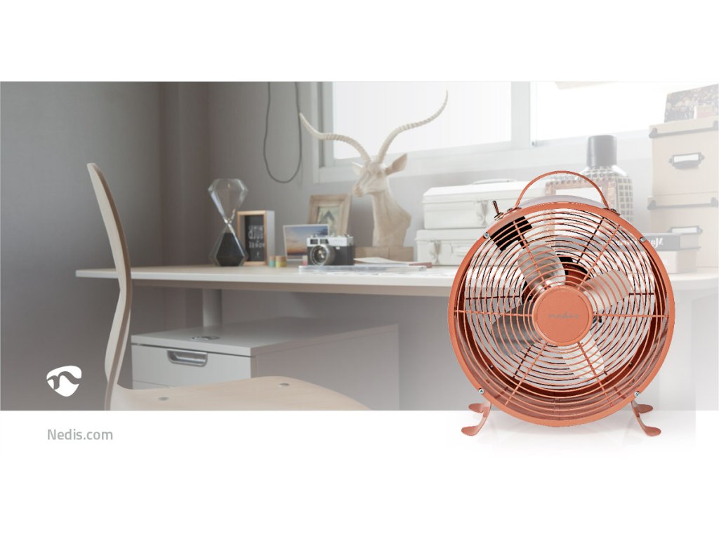 Tento retro Nedis stolní ventilátor je vybavený pevnou celokovovou konstrukcí s protiskluzovými nožičkami, díky kterým bude bezpečně stát na svém místě na stole. Disponuje dvěma rychlostmi, které zajišťují svěží vánek i během těch nejteplejších dní, a to jak doma, tak v kanceláři. Pokud se potřebujete přemístit, můžete si ventilátor díky držadlu navrchu vzít s sebou. Pomocí kabelu dlouhého 1,5 metru můžete ventilátor umístit přesně tam, kde ho potřebujete nejvíc.