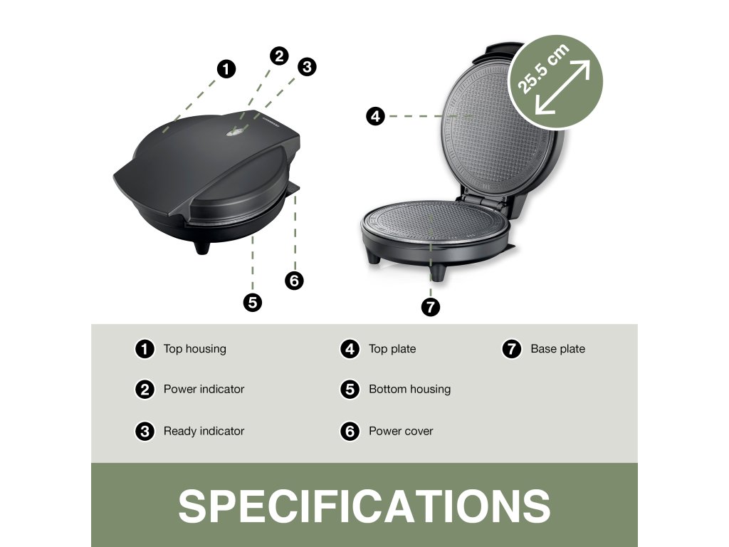 S tímto vaflovačem na zmrzlinu od společnosti Melissa si můžete sami doma připravit zcela čerstvé klasické vafle se zmrzlinou. Snadno se používá a součástí balení je i forma na vafle, takže všechny vafle budou stejnoměrné. Destičky mají nepřilnavý povrch a usnadňují následné čištění. Přístroj má příkon 700 W a světelný indikátor ukazuje, kdy je vafle upečena. Protiskluzové nožičky zajišťují stabilitu přístroje na stole. Po vychladnutí lze vafle naplnit kopečky oblíbené zmrzliny nebo jemné zmrzliny a ozdobit čokoládou, fondánem nebo posypem. Vaše výhody: • Pro chutné domácí vafle, zmrzlinové kornouty, vaflové koláčky nebo vaflové rolády. • Zábava pro každou příležitost • Vysoce kvalitní pečicí deska s nepřilnavým povrchem • Kontrolka připravená k použití a kontrolka napájení • Snadné čištění • Protiskluzové nožičky • Včetně formy na zmrzlinové kornouty a receptu na vaflové těsto Obsah balení: • Tvořítko na vaflové kornouty • Forma na vaflové kornouty • Manuál + bezpečnostní pokyny v DK/NO/SE/FI/UK/DE/NL/FR/ES Specifikace: Válcovačka je určena pro výrobu vaflí: • Značka: : Melissa • Rozměry: 25,5 x 11,3 x 20,6 cm • Barva: černá • Hmotnost: 1,52 kg • Příkon: 700 W • Délka kabelu: 66 cm