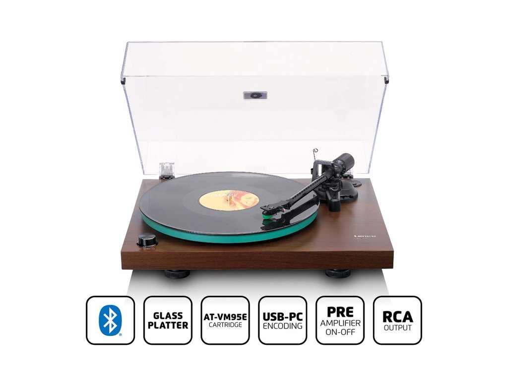The Lenco LBT-225 is a record player with Bluetooth® functionality. Connecting this record player to your Bluetooth® speaker or headphones is easy and convenient providing the ideal set-up for enjoying a full warm sound while lounging on your couch at home. Retrieve your old records from the attic and play them on this modern record player. Enjoy the crystal-clear sound of your vinyl, both old and new. Switch from 33 to 45 rpm to play your vinyl record at the right speed. Included is an analogue to digital conversion system, with a USB connection easily archive your precious vinyl to your computer using the USB port on the back of the record player. The LBT-225 has a glass record player platter, belt drive, RCA connection and a carbon fiber arm with a counterweight. The Audio-Technica cartridge AT-VM95E provides a warm sound and a Hifi quality to your precious records. The plastic cover ensures that your record player does not disappear under a layer of dust and protects it from any outside damage. The record player comes complete with CE-US multi-plug and AC power supply adapter. The Lenco LBT-225 is available in a dark walnut wood color. What's in the box? • Record player • Mat • Adapter • Adapter US plug • USB cable • RCA cable • 45 RPM adapter • Counterweight • Anti-skating weight • Cartridge AT-VM95E • Belt • Belt mounting wrench • Dust cover • Extra dust cover foot 2x • Manual NL/EN/DE/FR/ES • Quick start guide • Adjustment card for cartridge