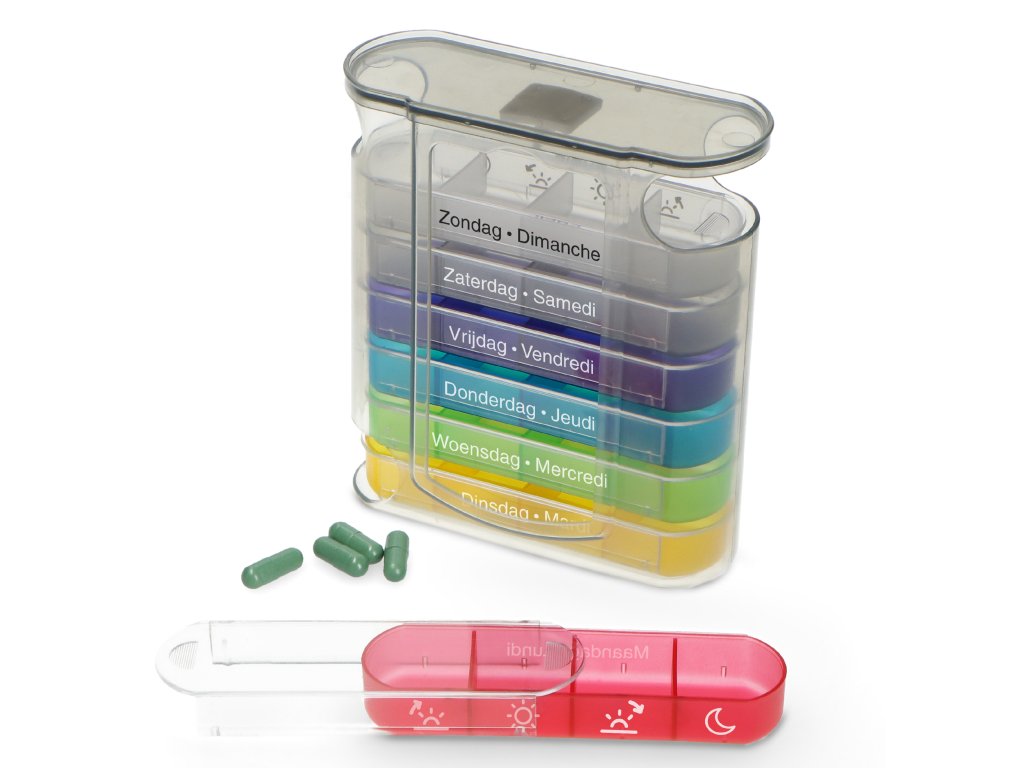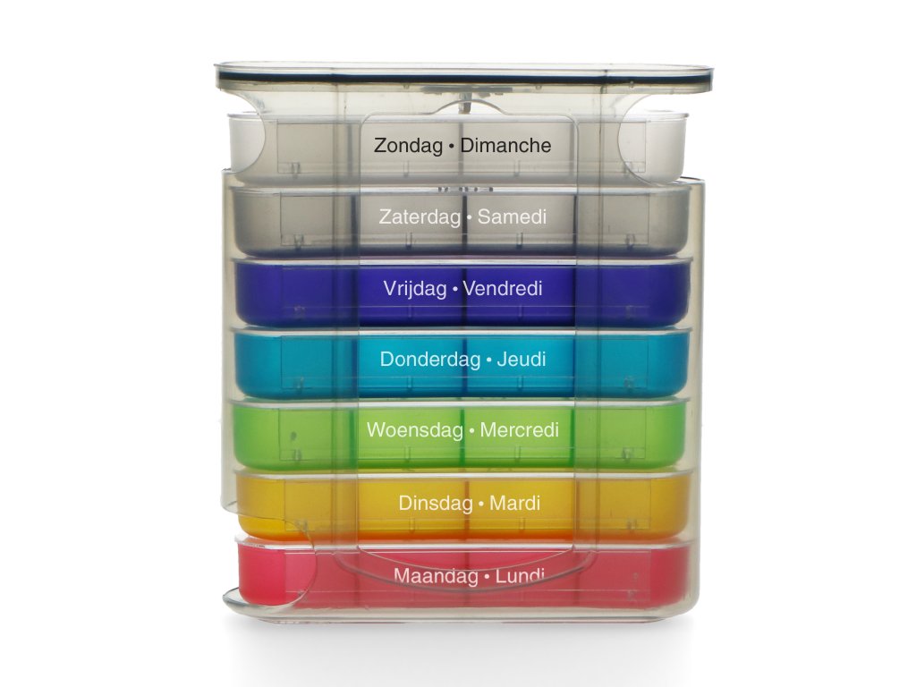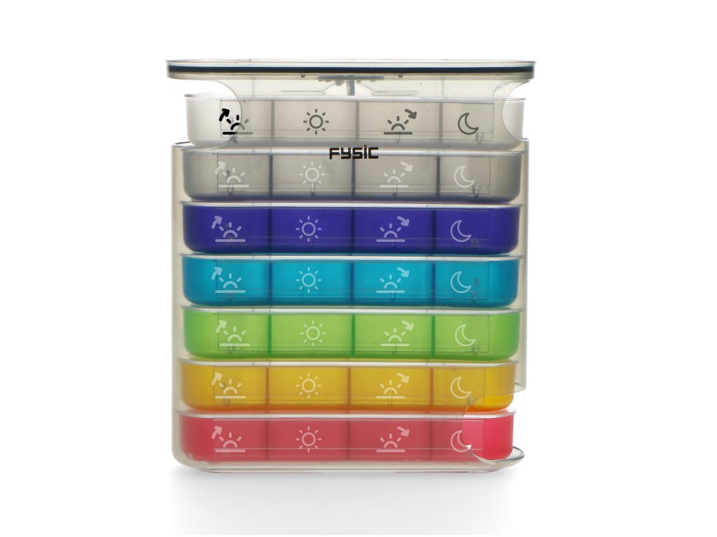 Krabička na tablety na 7 dní a 4 denní úseky • Fysic FC-53 Pill box • 7 krabiček na každý den v týdnu • Každá krabička na den má 4 denní oddíly • K dispozici v transparentní barvě s barevnými denními boxy. Co je krabička na pilulky FC-53? Na každodenní návyky se někdy zapomíná nejsnáze. Zapomněl jsem zamknout dveře? Jsou všechna okna zavřená? Vzal jsem si své prášky? Bez opakování úkonu je těžké si vzpomenout, co jste dělali dnes stejně jako včera. K tomu slouží tato krabička na pilulky se sedmi oddělenými přihrádkami. Každá přihrádka má svou barvu a poskytuje prostor pro pilulky na čtyři části dne. Krabičku naplníte každý týden a už nikdy nevynecháte žádnou dávku a jako další efekt si předem všimnete, kdy zásoby dojdou a budete potřebovat opakovaný recept. Jak krabička na pilulky funguje? Jednotlivé dny v týdnu jsou označeny na samostatné nádobce. Krabičku můžete mít celou pohromadě nebo si vzít jednodenní nádobku s sebou, když jdete ven, každá nádobka má čtyři přihrádky pro uložení tablet pro části dne. Robustní posuvný systém se snadno používá tak, že po použití vložíte prázdnou nádobku do zadní části držáku. Tímto způsobem dochází k chybám jen zřídka! Ideální řešení, pokud potřebujete užívat určitou tabletu v pravidelných intervalech. Je krabička na pilulky bezpečná? Díky jasnému intuitivnímu použití je používání této krabičky na pilulky bezpečné. Krabička je navíc vyrobena z plastu bez obsahu BPA, s touto krabičkou na pilulky vám nehrozí žádné riziko. Jaké jsou výhody této krabičky na pilulky? Na tuto krabičku na pilulky se můžete spolehnout při každodenním používání léků. • Krabička se skládá ze sedmi nádobek; jedna pro každý den v týdnu. • Každá nádobka má čtyři denní oddíly, pro případ, že si musíte léky brát v pravidelných intervalech. • Nádobku můžete vyjmout na jeden nebo více dnů zvlášť. • Na první pohled vidíte, zda jsou v kontejnerech ještě tablety • Díky barvám snadno rozlišíte jednotlivé dny. Každá krabička je navíc označena dnem Společnost Fysic vyvíjí chytré produkty, které přispívají k pohodlnějšímu a nezávislejšímu životu. Nabízíme vám řadu kvalitních a promyšlených výrobků. Co je v krabici? • Krabička na pilulky • Stručný návod k použití NL / EN / DE / FR
