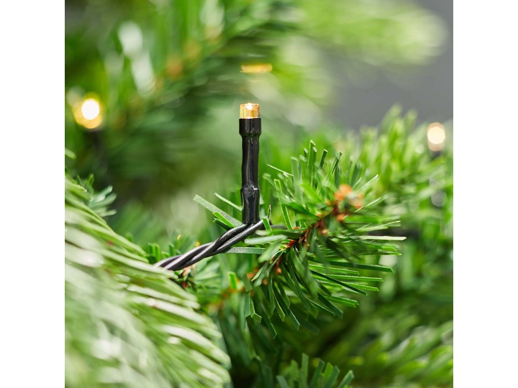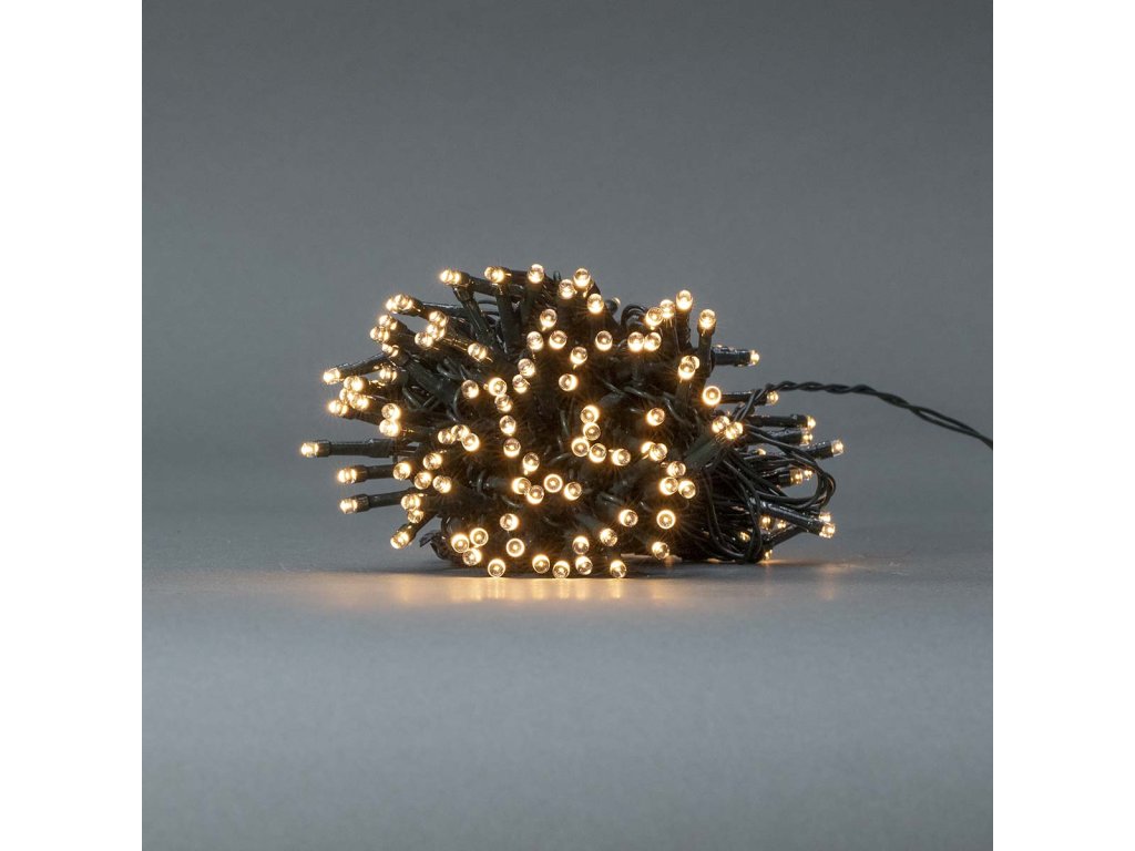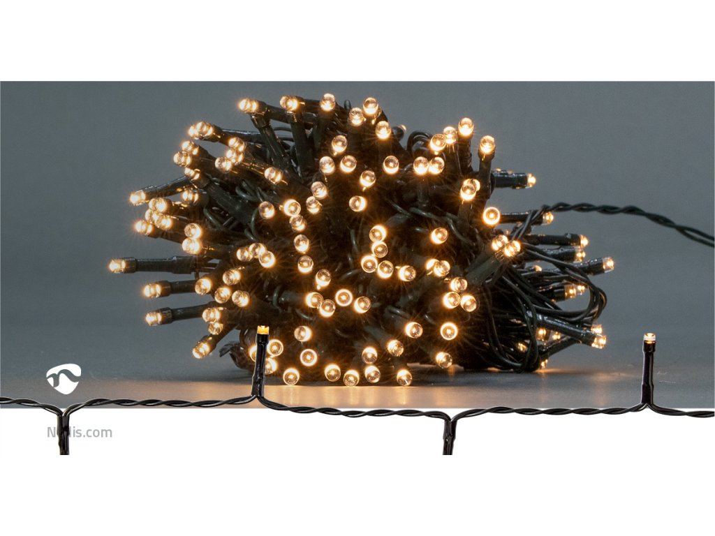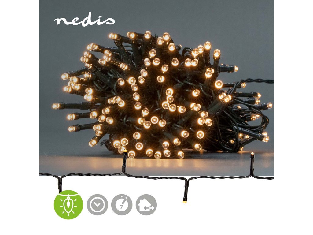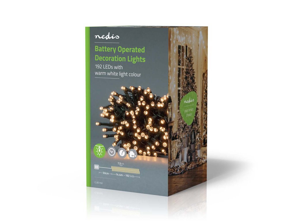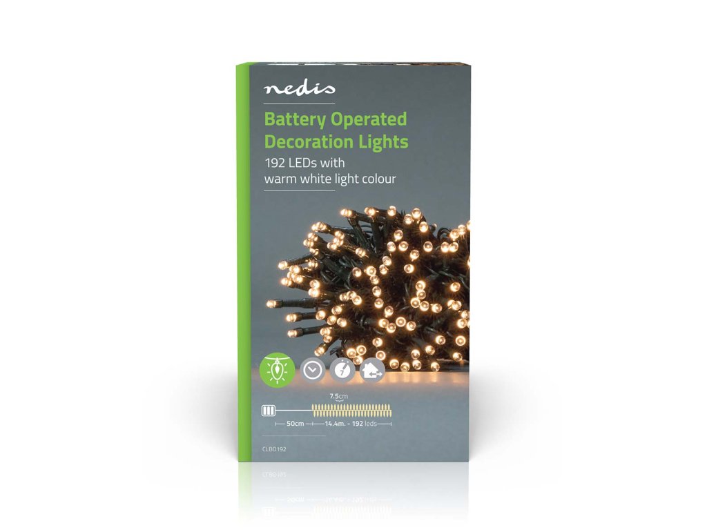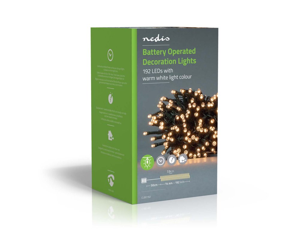 Tato Nedis dekorativní LED světla o délce 14,4 metrů vytvoří ve Vašem domě příjemnou atmosféru teple bílého světla. Provoz na baterie tomuto zařízení dodává maximální flexibilitu. Umístěte světla, jak jen chcete, ať už rovně, cikcak nebo do kulatého tvaru a vyberte jeden ze 7 přednastavených efektů, které hrají různými tvary, nebo režim stálého svícení. Používejte přednastavený časovač zapnutí a vypnutí k naplánování svícení a už nikdy se světelný řetěz nezapne ve špatnou dobu. Průhledná barva kabelu se hodí na jakýkoli strom nebo pozadí a nijak nenarušuje výsledný vzhled. Řetěz obsahuje celkem 192 LED diod s rozestupem 7,5 centimetrů od sebe. Díky celkové délce 14,9 metru se nemusíte bát, že napájecí kabel nedosáhne k některé zásuvce. Řetěz je možné používat uvnitř i venku.