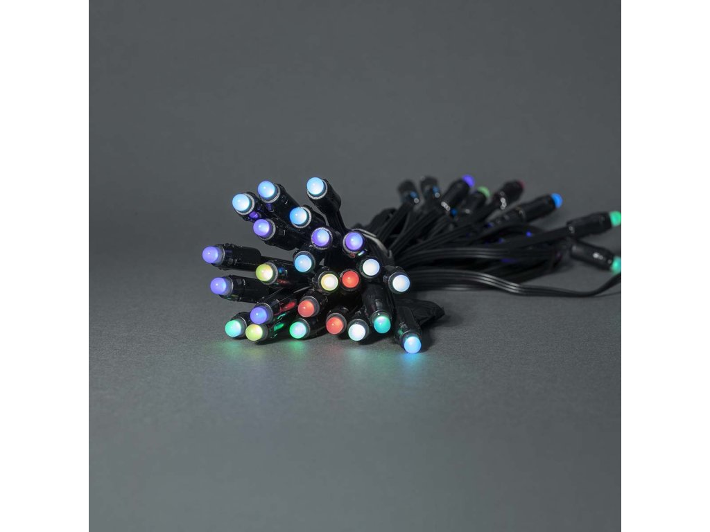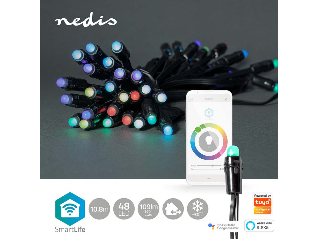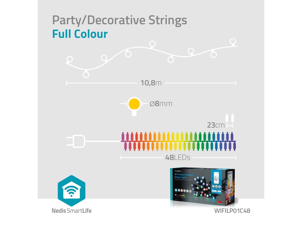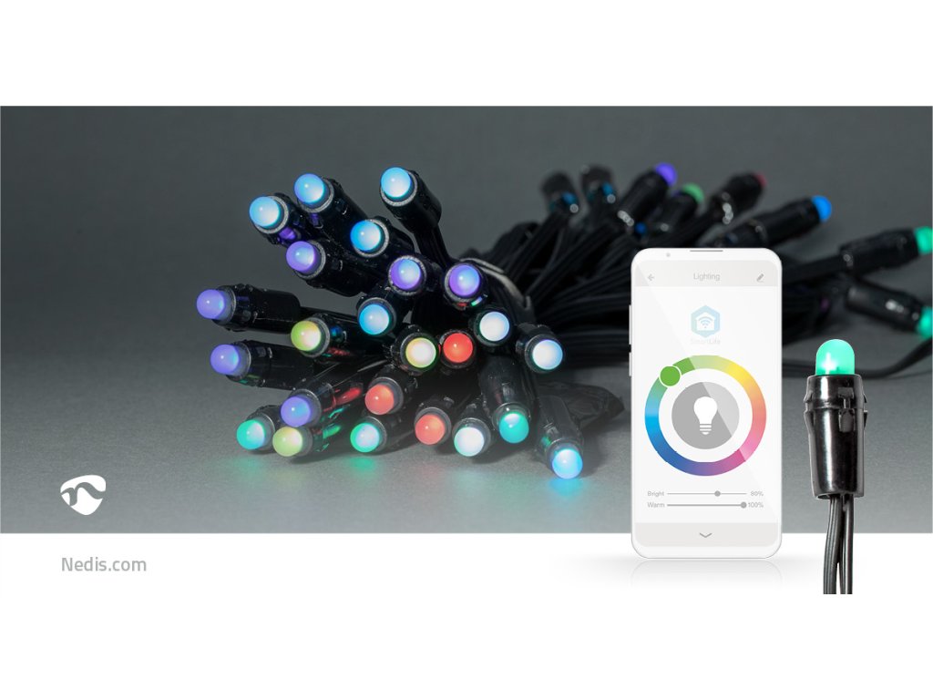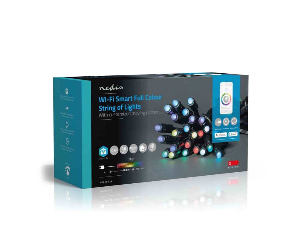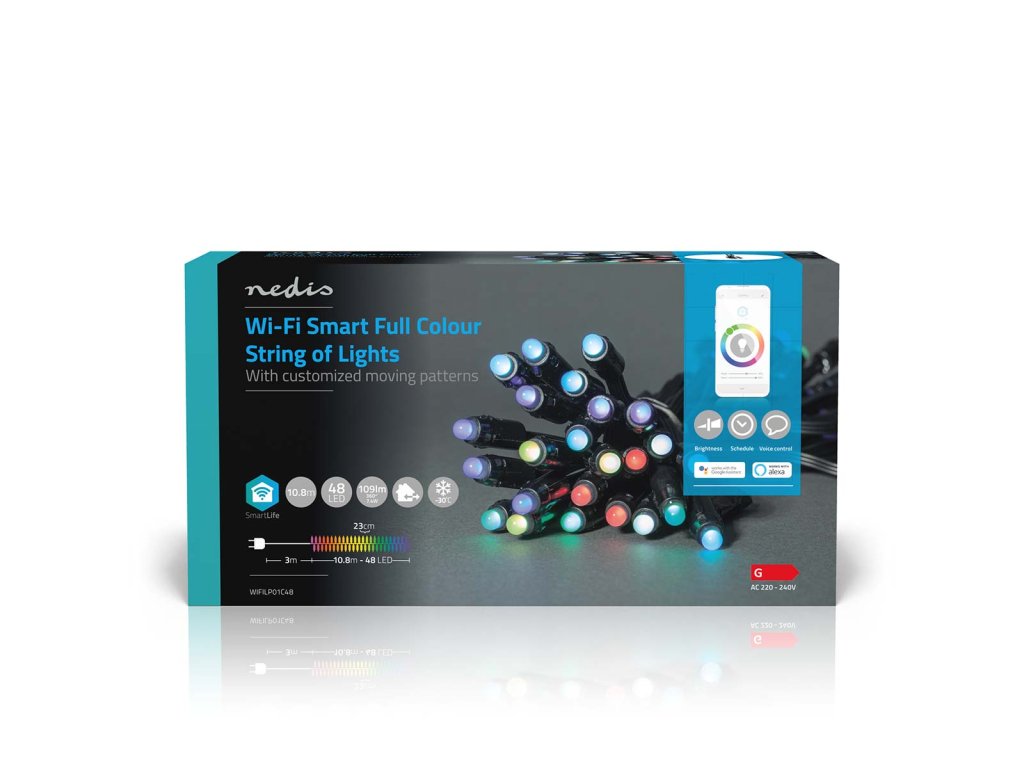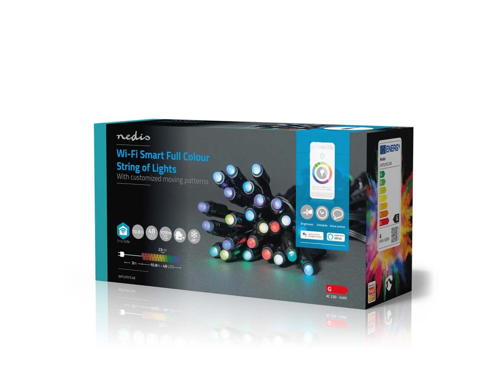 Tento plnobarevný Nedis chytrý Wi-Fi světelný řetěz RGB+ o délce 10,8 metru se snadno používá a přináší ty nejpokročilejší technologie pro dekoraci vašeho domova. Jednoduše světýlka vyvěste, jak chcete, ať už rovně, klikatě nebo dokola, a ovládejte je pomocí aplikace Nedis SmartLife. Každá LED dioda mění barvy a představuje jeden pixel, který můžete jednotlivě ovládat pomocí aplikace. Navíc máte také možnost vytvářet přizpůsobené pohyblivé vzory. Pro ještě větší pohodlí můžete nastavit časovače a harmonogramy tak, aby se světelný řetěz vždy rozsvítil v ten správný čas. Pomocí hlasového ovládání prostřednictvím asistentů Amazon Alexa nebo Google Assistant můžete řetěz pouhým hlasovým příkazem zapnout a vypnout nebo ztlumit či navolit jeho jas. Integrovaná funkce mikrofonu umožňuje, aby diody reagovaly na hudbu nebo jiné zvuky. Černá barva kabelu se hodí ke každému pozadí a nijak nenarušuje výsledný vzhled. Řetěz dlouhý 10,8 metru obsahuje celkem 48 LED diod o průměru 8 mm. Díky napájecímu kabelu o délce 3 metrů se nemusíte bát, že nedosáhnete k zásuvce. To se velice hodí zejména tehdy, pokud máte zásuvku kousek dál. Řetěz je možné používat venku i uvnitř. Snadné nastavení Chytrý Wi-Fi světelný řetěz funguje i bez brány a stane se přímou součástí bezdrátové sítě – díky tomu není nastavení složité ani nákladné. Světelný řetěz můžete ovládat pomocí bezplatné aplikace Nedis SmartLife, která umožňuje nastavovat automatický režim podle časového rozvrhu, západu slunce nebo ostatních produktů Nedis SmartLife. V kombinaci s asistenty Google Home nebo Amazon Alexa můžete dokonce používat hlasové příkazy ke změně vzorů na světelném řetězu.