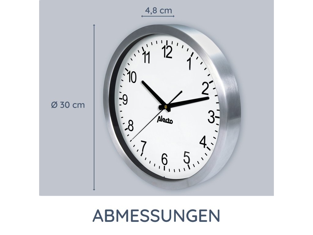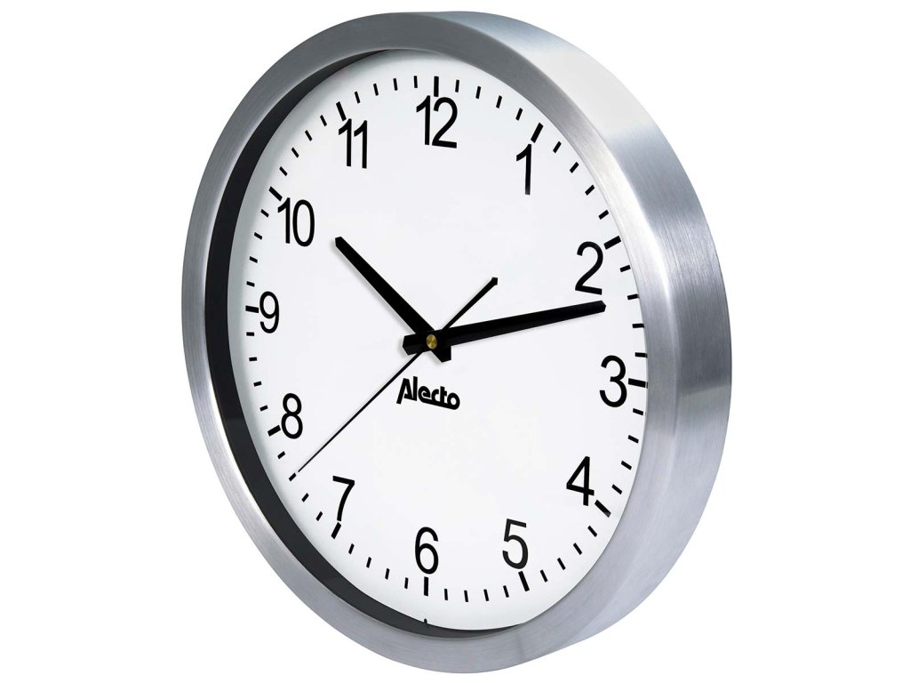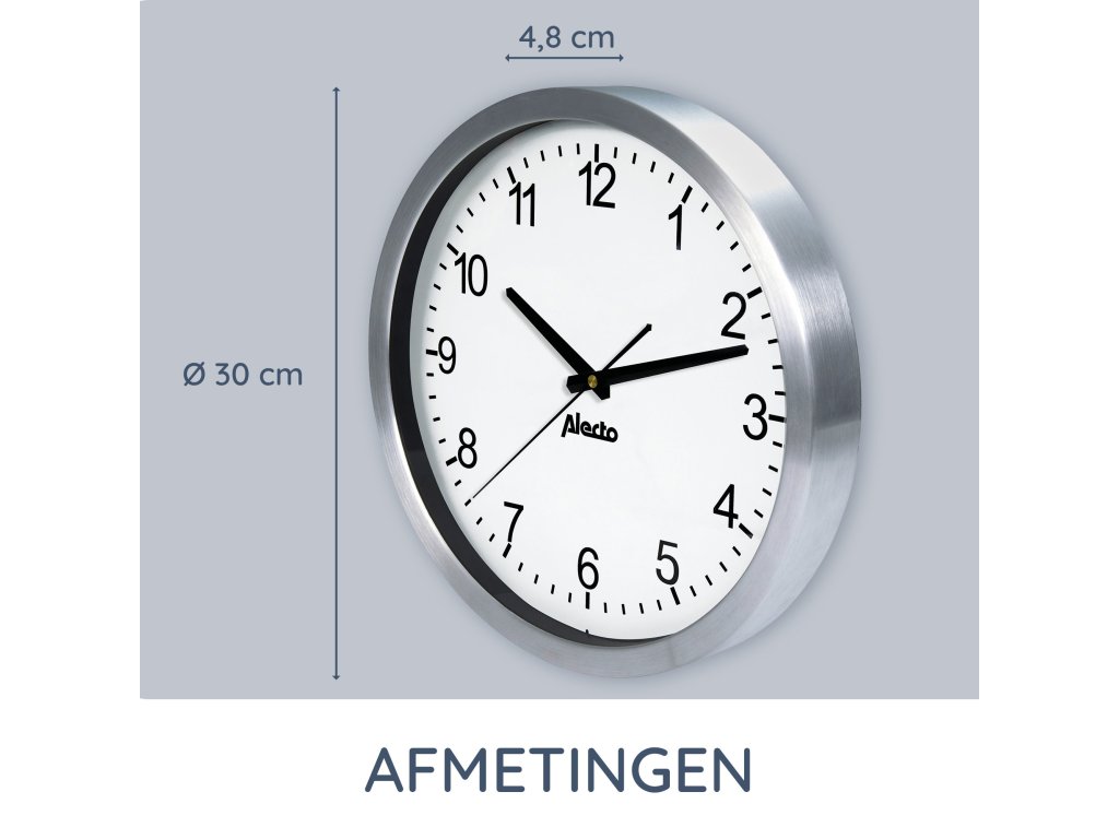 Alecto AK-10 Velké analogové nástěnné hodiny • Extra velký a čitelný ciferník • Tichý hodinový strojek • K dispozici v barvě: hliník Tyto hliníkové analogové hodiny ukazují čas. Díky průměru 30 cm můžete hodiny používat ve velkých místnostech, díky extra velkému ciferníku lze čas odečíst i z větší vzdálenosti. Hodiny pracují tiše, takže vás žádné tikání nebude rušit. Hliníkové hodiny s quartzovým strojkem Hodiny mají quartzový strojek. To znamená, že hodiny používají křemenné krystaly, které vibrují na stejné frekvenci. To zajišťuje velmi přesné měření času. Frekvence křemenných hodin je stejná v celém našem vesmíru. Quartzové hodiny fungují na baterie (jedna baterie AA), které je nutné vyměnit pouze jednou za několik let. Hliníkové hodiny mají elegantní design, snadno se používají a splňují naše standardy vysoké kvality. Nabízíme spolehlivý výrobek za atraktivní cenu. Co je součástí balení? Analogové nástěnné hodiny Univerzální návod