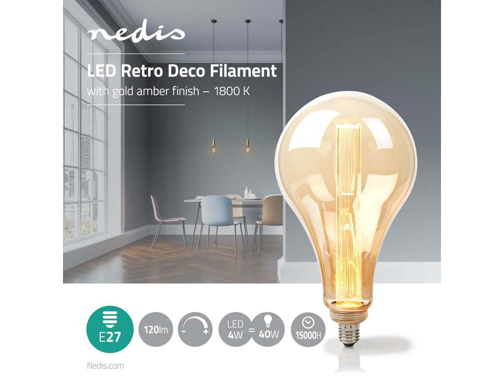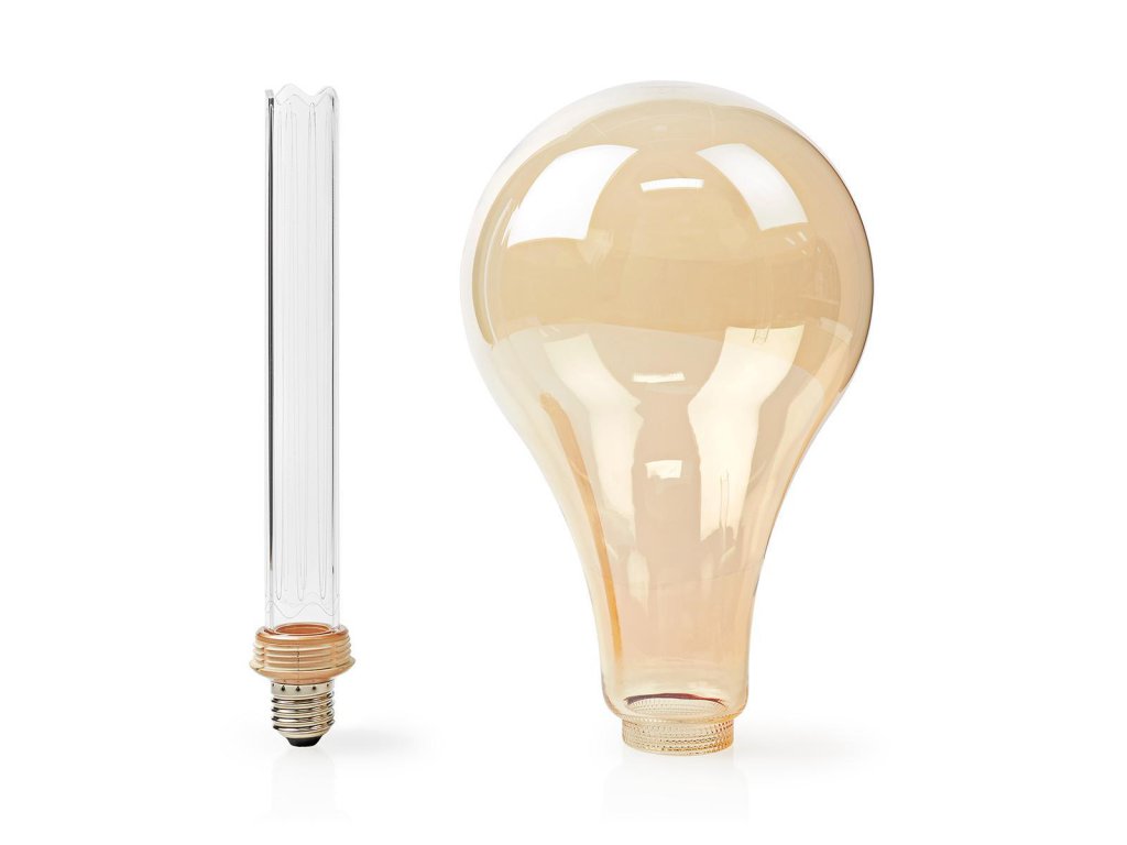 Tato retro žárovka s paticí E27 retro deco PS165 (Ø 16,5 cm) s jantarově zlatou povrchovou úpravou skla obsahuje trubičku z plexiskla s laserem vykresleným vzorem, který odráží světlo, a vytváří tak ohromující efekt. LED světlo naspodu žárovky má příkon pouhé 4 watty. Vnější skleněná baňka žárovky se dá odejmout a vyměnit za banky rozličných tvarů. Tato žárovka vytváří nezaměnitelnou retro atmosféru. Je ideální do otevřených svítidel, lustrů nebo k použití samostatně. Vnější baňka je celá ze skla. Světelný výkon 120 lumenů a teplota barvy 1 800 K poskytují teplé bílé světlo. Jantarově zlaté sklo podtrhuje nezaměnitelný design žárovky a zajišťuje příjemný rozptyl světla.