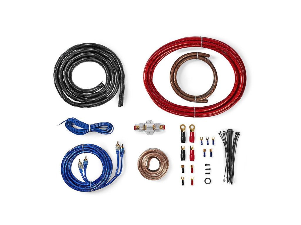 Kabelová sada Nedis® CKIT920VA pro instalaci výkonného zesilovače a reproduktorů do automobilu. Obsahuje všechny nezbytné kabely, konektory, pojistky a montážní příslušenství pro zapojení zesilovače a reproduktorů s výkonem do 800 W.