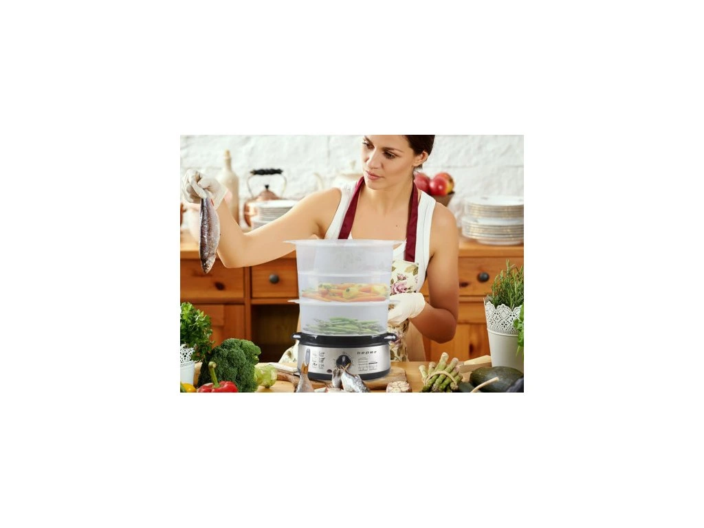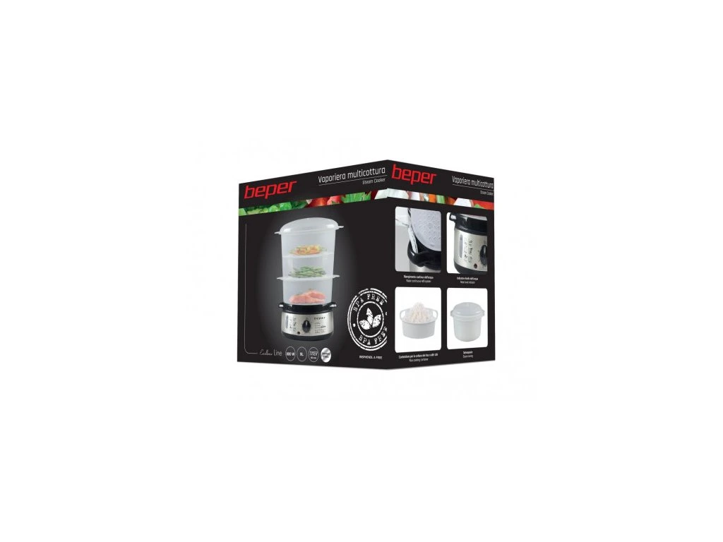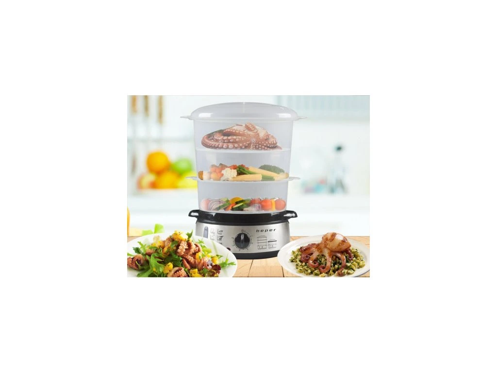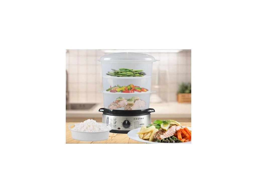Parní hrnec Beper BC250 se 3 parními nádobami a nádobou pro vaření rýže připraví jídlo skoro sám, navíc je zdravější, chutnější a barevnější než při smažení na oleji.
