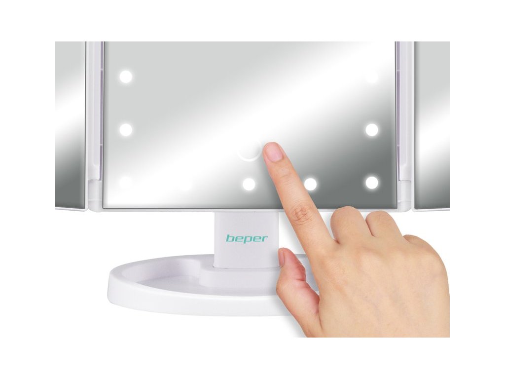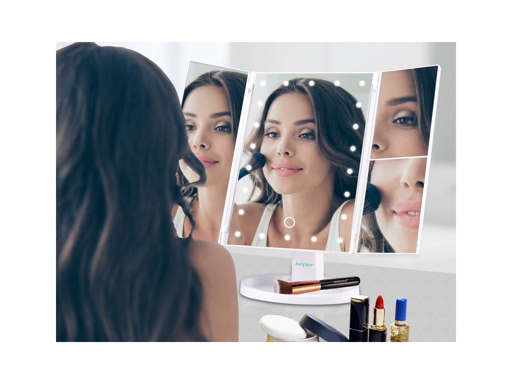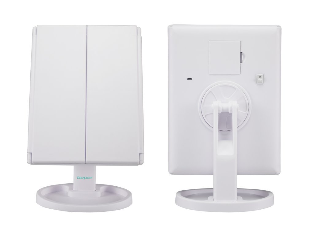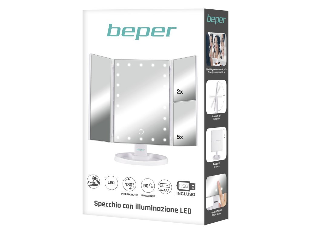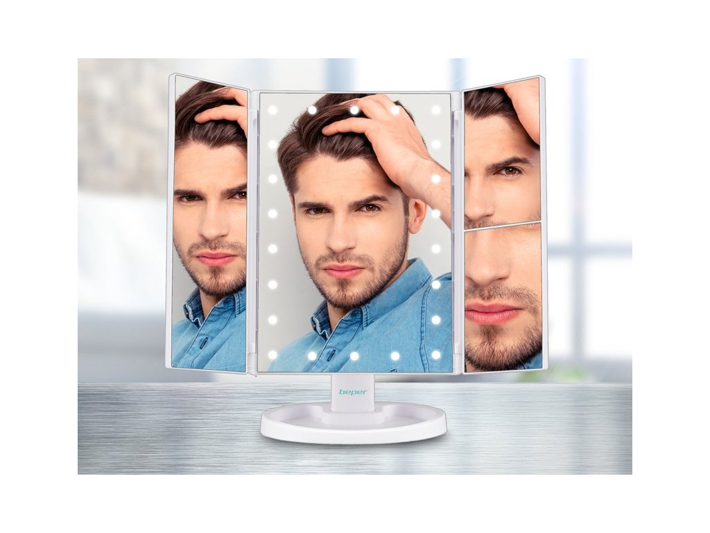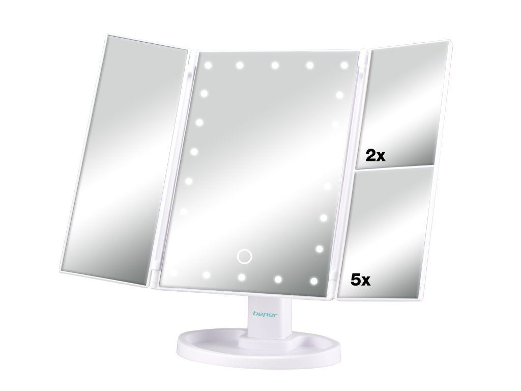 BEPER P302VIS050 kosmetické zrcadlo s LED osvětlením je praktickým řešením pro pohodlné a bezchybné líčení a obecně pro péči o pleť. S 22 vestavěnými světelnými body LED, ideálně nasvítí váš obličej. Nabízí 3 úrovně zvětšení (normální, 2x a 5x), což zvláště oceníte při detailním tvarování, vytrhávání chloupků či konturování rtů a očí.