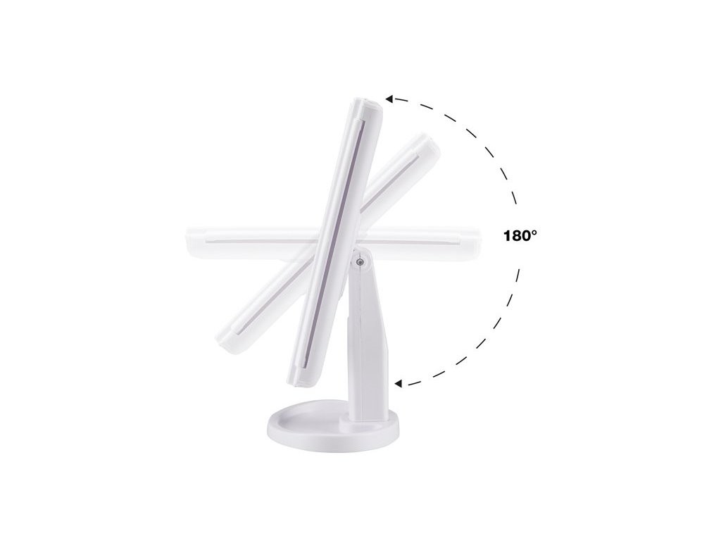 Praktičnost doladí dotykové zapínání / vypínání a jeho odkládací základna. Otáčí se, naklání se a má dvojí napájení (baterie nebo USB), to vše pro vaše maximální pohodlí.