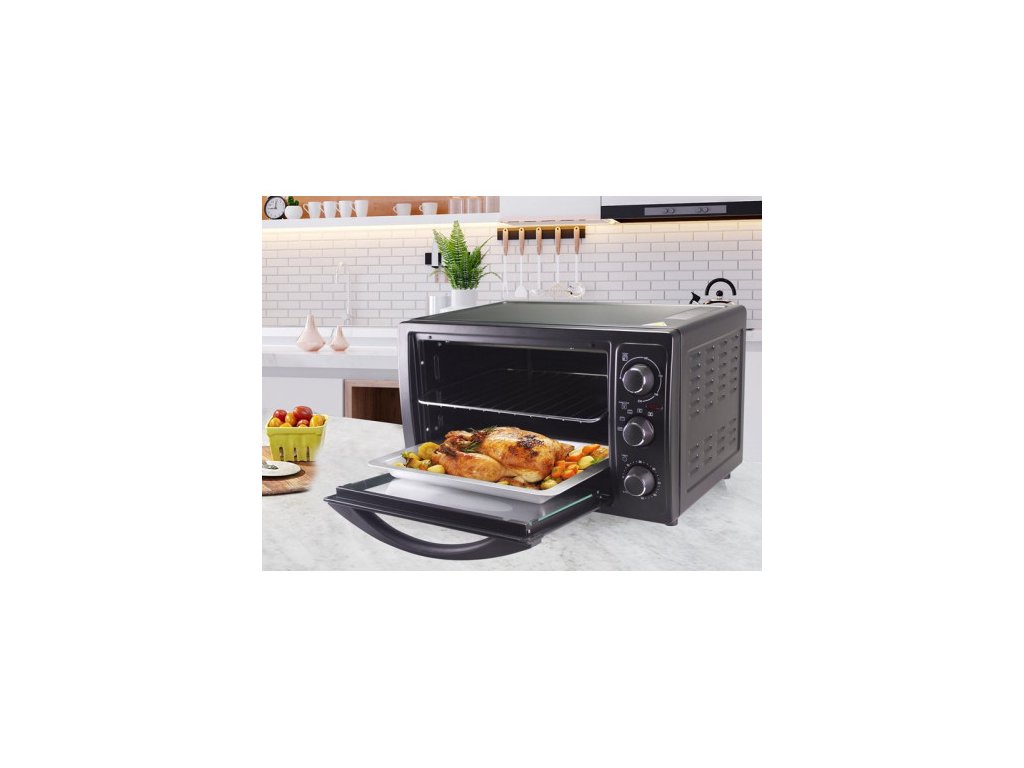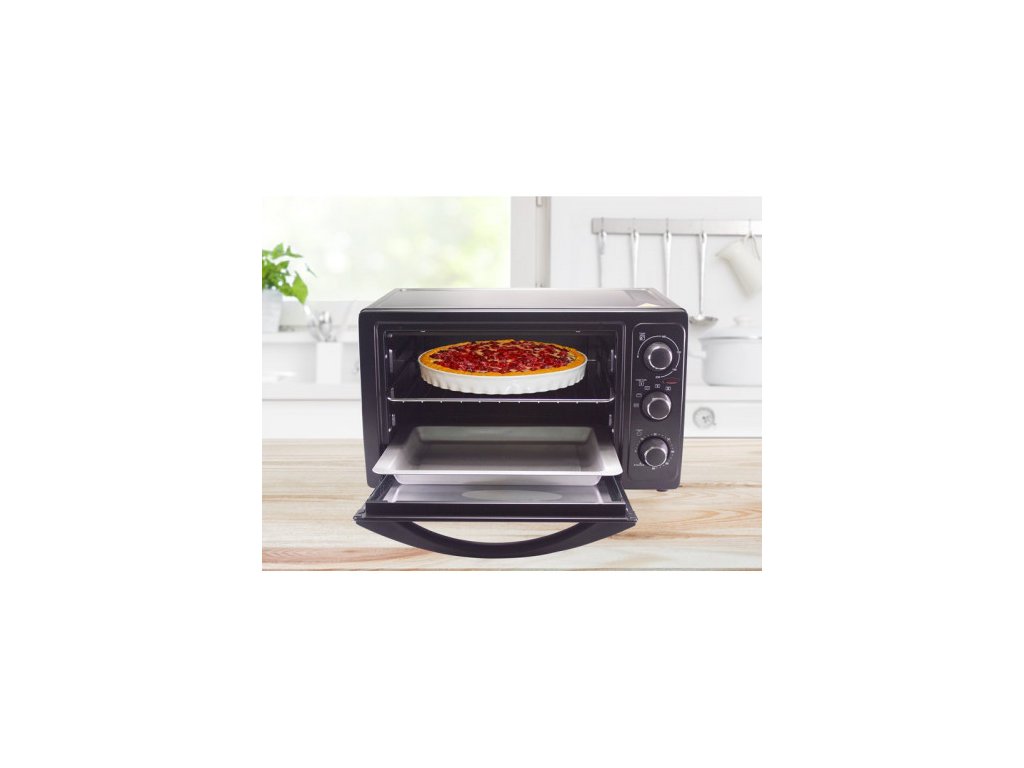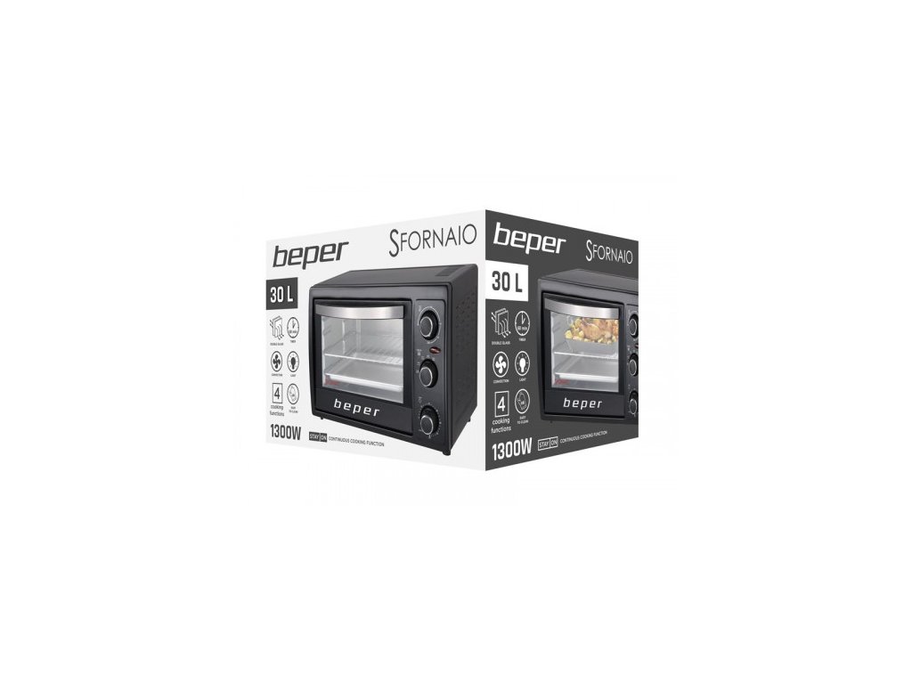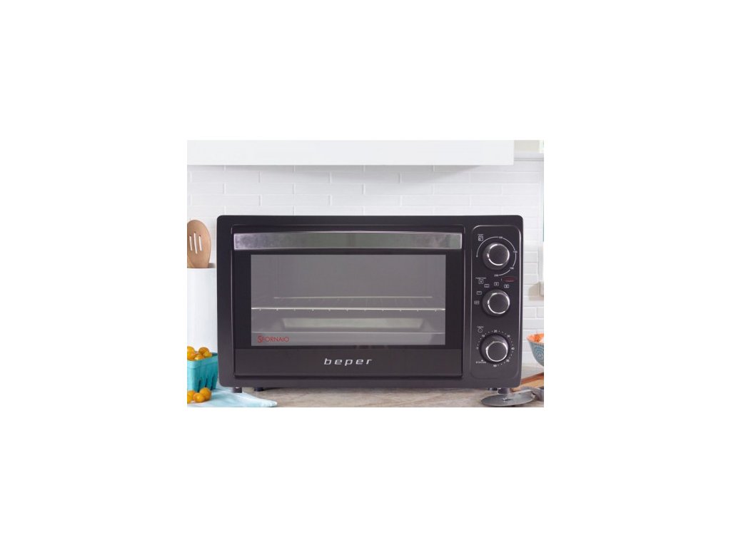 BEPER 90884 elektrická trouba 30l - kompaktní trouba s uživatelsky přívětivým designem a ocelovými topnými tělesy. Stylová a snadno uchopitelná tepelně izolovaná rukojeť usnadňuje otevírání a zavírání dveří s dvojitým sklem, na spodku je podnos na drobky a odkap je odnímatelný pro snadné čištění.