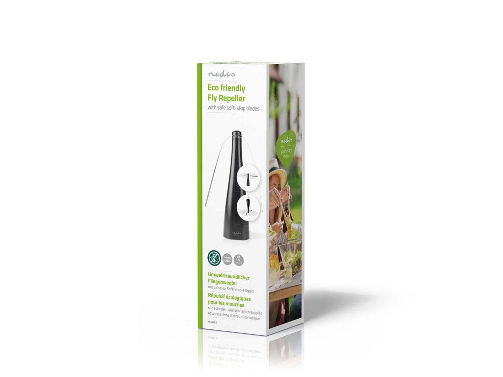 Proud vzduchu vyvolaný měkkými lopatkami spolu s reflexními pruhy odpudí mouchy a jiný létající hmyz od vašeho talíře. Tento odpuzovač nevyužívá na rozdíl od ostatních odpuzovačů nebo sprejů proti hmyzu žádné chemikálie, díky čemuž je bezpečnější pro děti a miminka.
