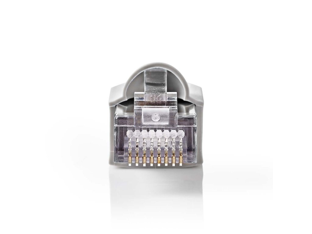 Balení 10 ks stíněných konektorů RJ45 pro CAT5 UTP kabely s drátovými vodiči. Balení obsahuje 10 ks konektorů včetně ochranných krytek šedé barvy.