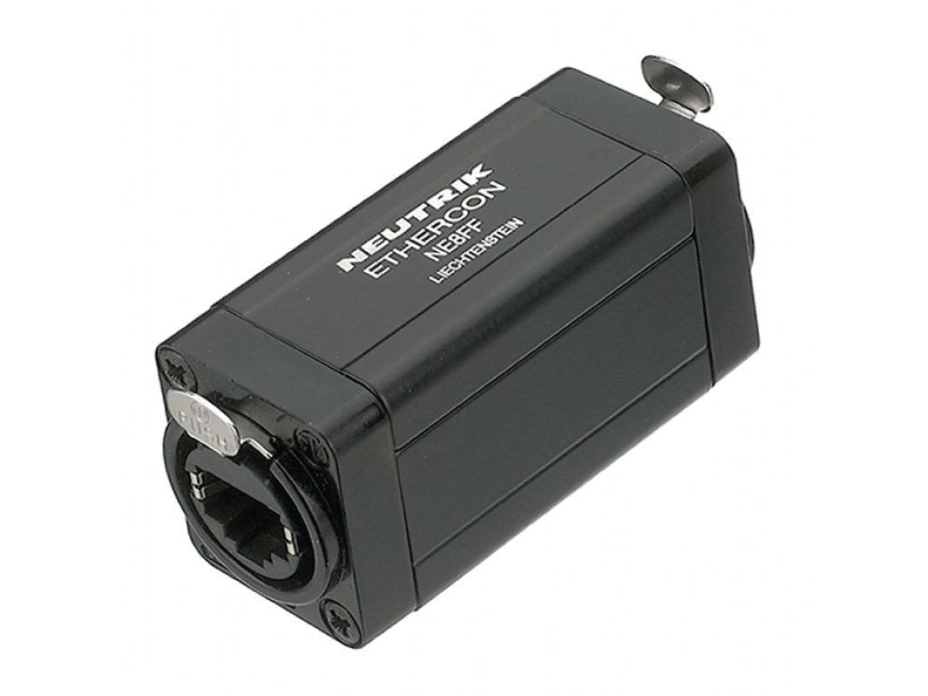 Neutrik průchodková síťová spojka vhodná k propojení dvou kabelů CAT5. Verze zapojení 1:1, vhodná pro zástrčky EtherCon® a standardní zástrčky RJ45.