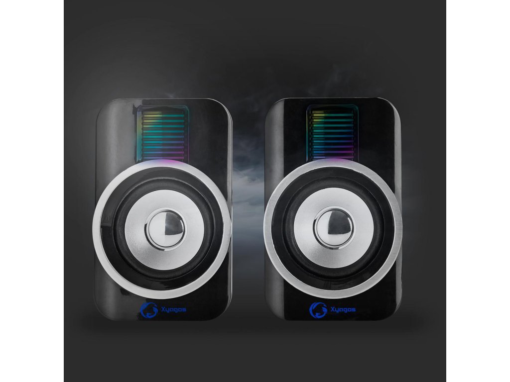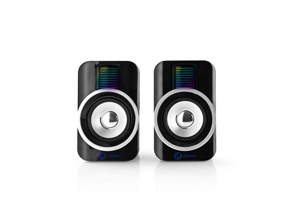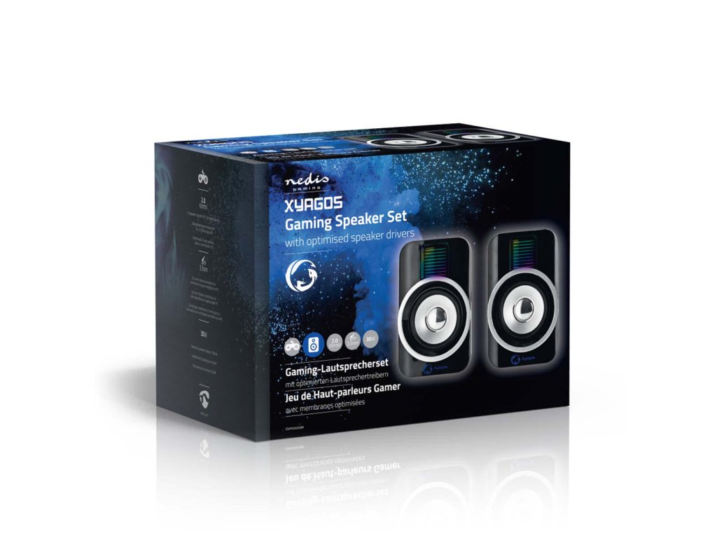 Nedis® herní 10 W stereo reproduktory XYAGOS s USB napájením a světelnými RGB efekty. Reproduktory se připojují k počítači pomocí 3.5 mm stereofonního konektoru a lze je napájet prostřednictvím USB – není tedy potřeba žádný externí napájecí adaptér.
