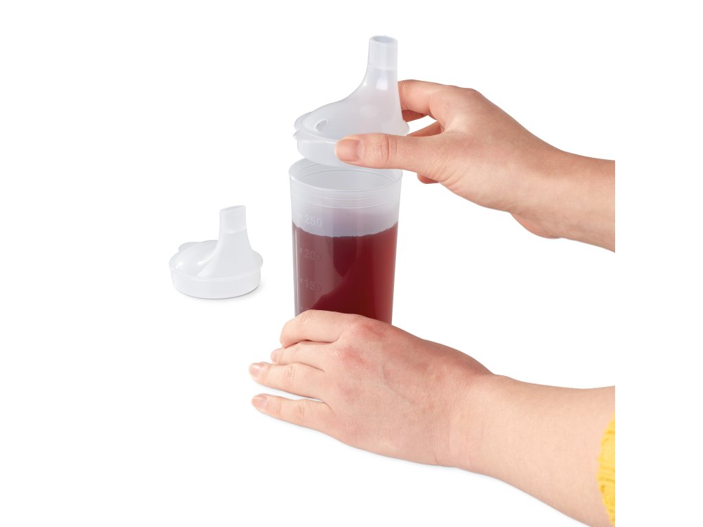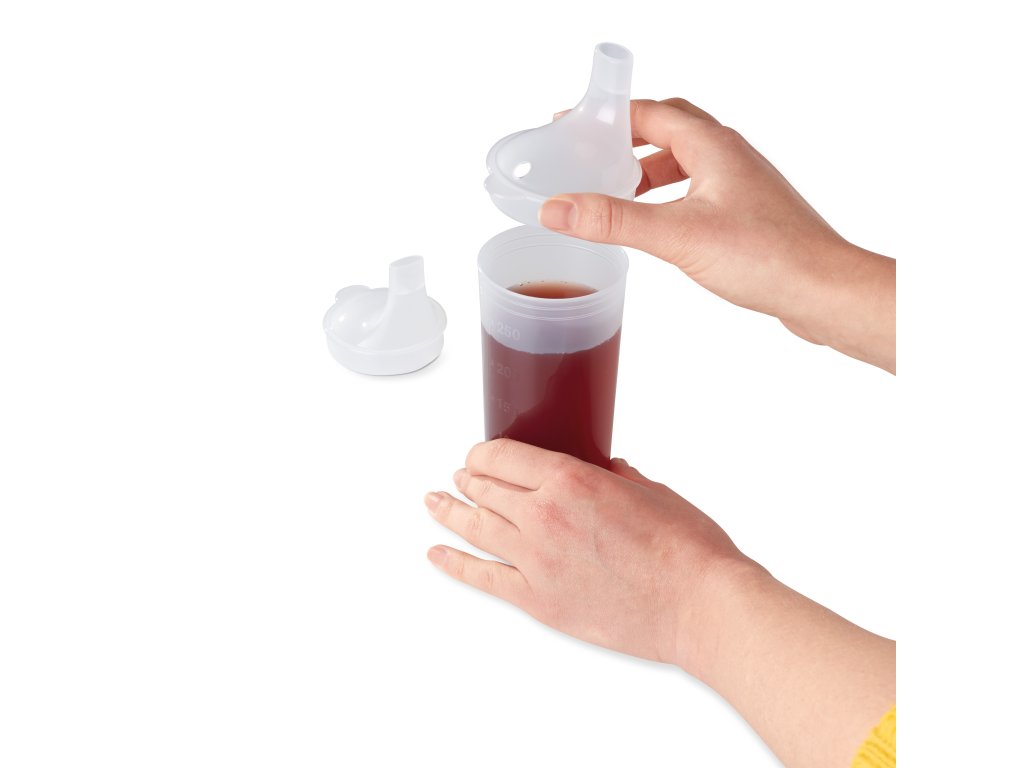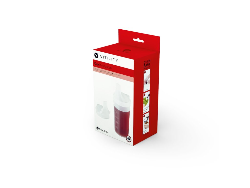 Transparentní kelímek pro lidi s omezenou hybností. Vhodný je také pro ležící, u kterých je potřeba sledovat, kolik toho vypijí. V těchto situacích pomáhá VITILITY průhledný kelímek s odměrkou a dvěma víčky s pítkem (usnadňují pití, nápoj se nevylije). Jedno pítko má menší otvor a je určeno k pití tekutin, druhé s větším otvorem je vhodné pro potraviny jako jsou kaše, jogurty. Maximální obsah kelímku je 250 ml a je vhodný do mikrovlnné trouby a myčky.