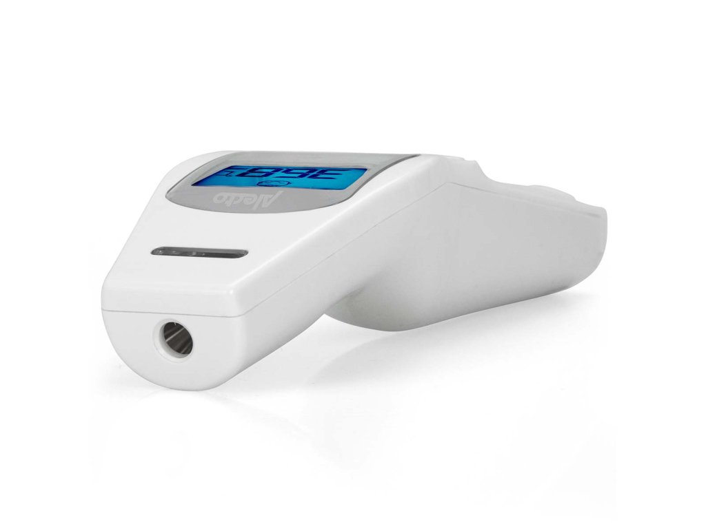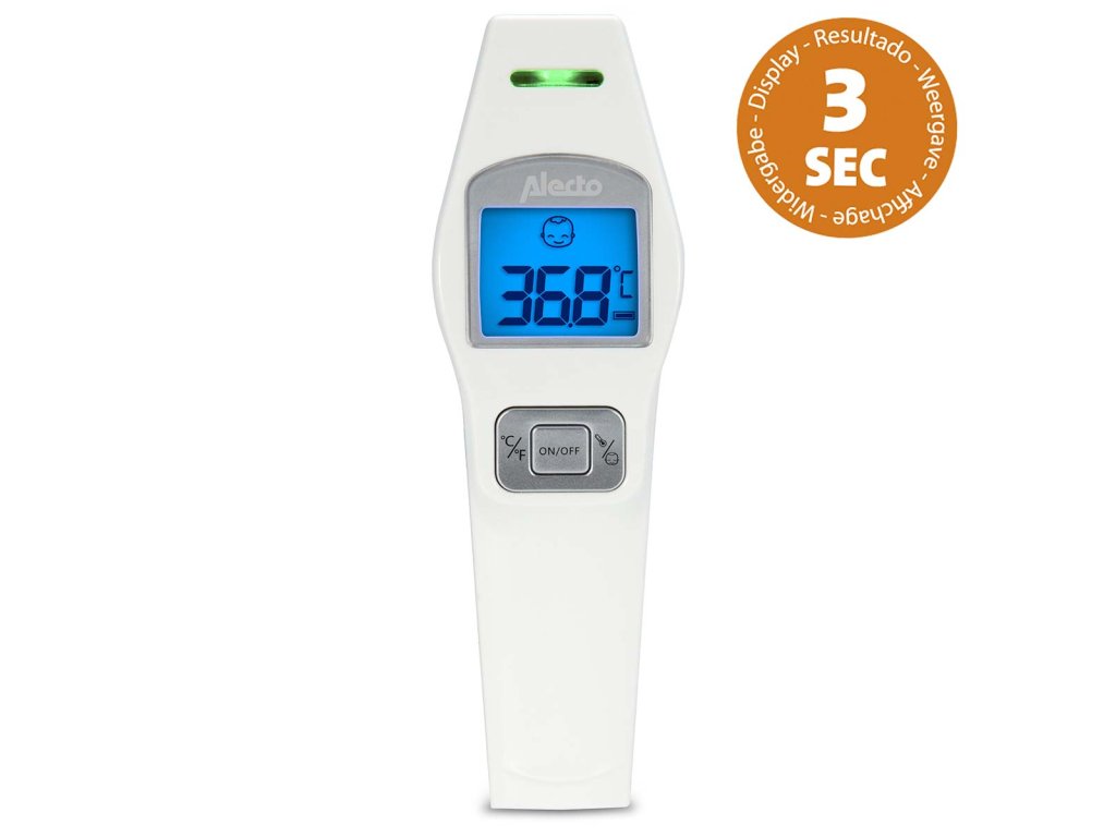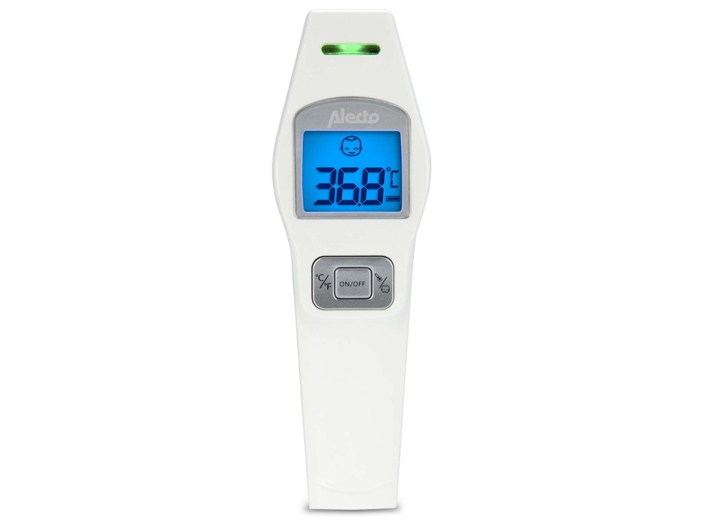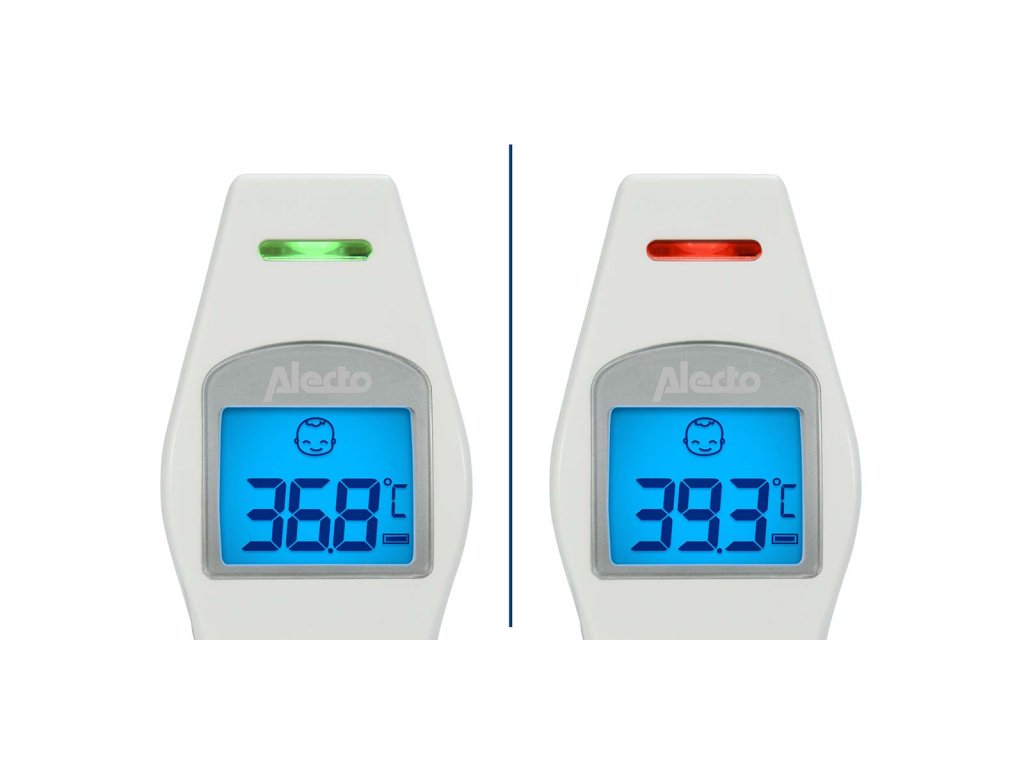 Bezdotykový infračervený teploměr Alecto BC-37 měří teplotu vašeho dítěte na čele. To znamená: žádné potíže s teploměry v uchu nebo hýždích, což může být pro malé dítě s horečkou nepříjemné. Měření je rychlé a snadné a displej můžete nastavit na stupně Celsia nebo stupně Fahrenheita. Pokud teplota vašeho dítěte stoupne nad 37 °C (nebo 98,6 °F), infračervený teploměr vám to dá vědět několika způsoby: uslyšíte zvuk, zelené světlo se rozsvítí červeně a na displeji uvidíte údaj o teplotě, takže tento teploměr mohou bez námahy používat i ti, kteří přesně nevědí, která teplota znamená horečku.