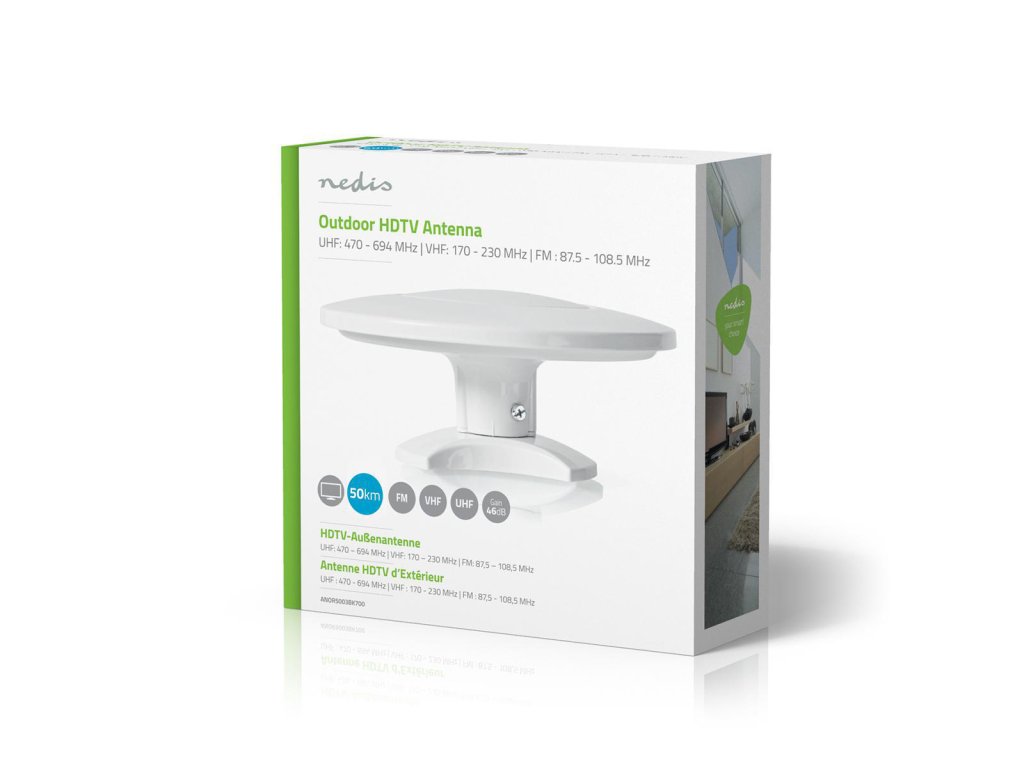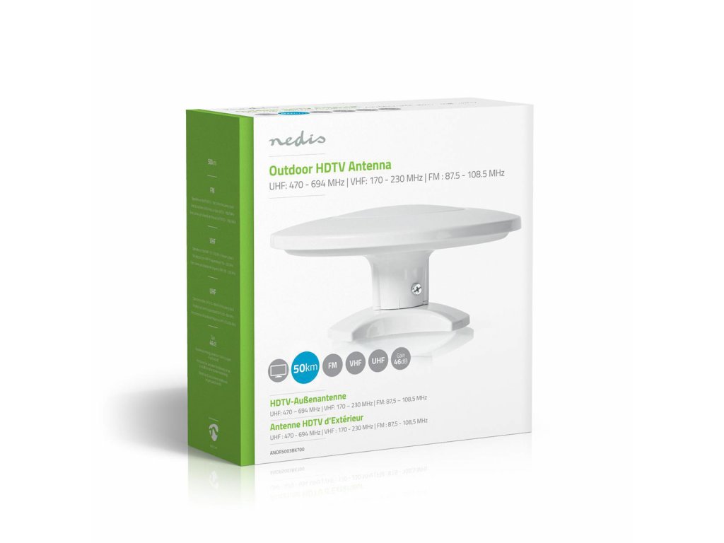 Aktivní 46 dB venkovní anténa Nedis® pro příjem televizního DVB-T a DVB-T2 vysílání a FM rádia. Anténa má vestavěný filtr LTE700 pro omezení vlivu 4G sítí. Snadno se instaluje a je vhodná pro všechny DVB-T/T2 přijímače s napájením zesilovače prostřednictvím anténního kabelu. Dodávána s napájecí výhybkou a externím zdrojem pro napájení v případě použití s přijímači bez napájení pro aktivní antény.