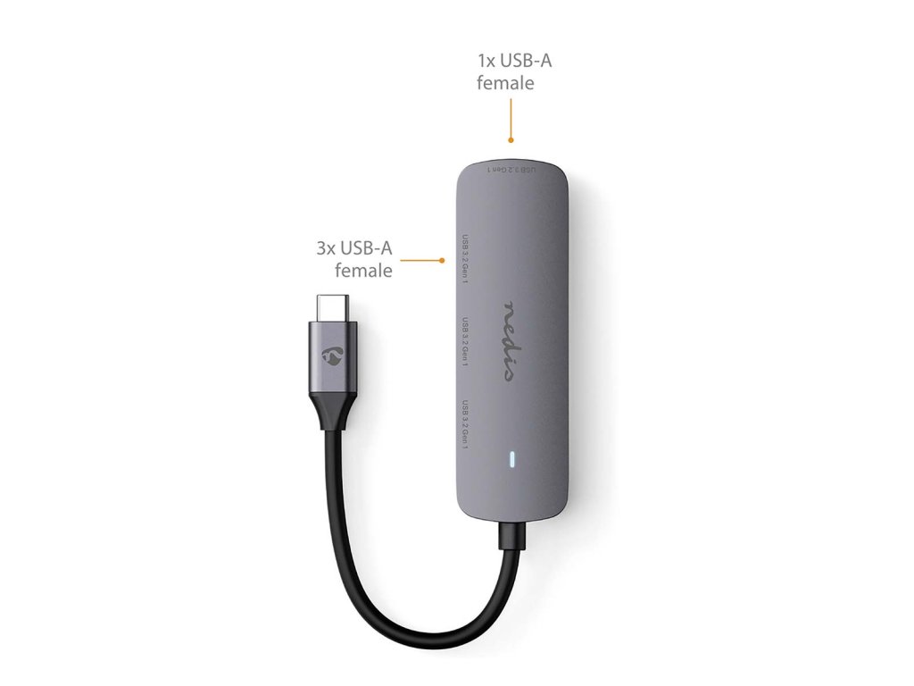 Tento rozbočovač Nedis USB Hub je vybaven 4 porty USB 3.2 Gen 1. Ty jsou zpětně kompatibilní s USB 2.0. Umožňuje připojit více zařízení USB k portu USB-C vašeho notebooku. Jednoduše připojte stávající standardní zařízení USB k notebooku USB-C™ pomocí 4portového rozbočovače. Po připojení k portu USB-C™ notebooku přidá 4 porty USB, které umožňují připojení stávajících zařízení USB-A. Všechny porty na 4portovém rozbočovači USB-C podporují rychlost přenosu dat 5 Gb/s. Hub je napájen ze sběrnice, takže není potřeba žádný externí napájecí adaptér. Lehký hliníkový rozbočovač má pevný připojený kabel, což z něj činí dokonalý přenosný doplněk k vašemu notebooku. 4portový USB rozbočovač je plně Plug & Play, což znamená, že není vyžadován žádný další software ovladače a vše zprovozníte velmi rychle.