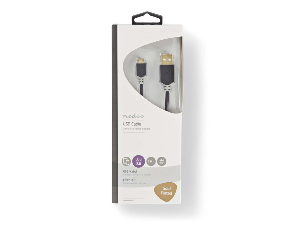 Značkový Nedis® propojovací kabel zástrčka USB 2.0 A - zástrčka USB micro B pro přenos dat rychlostí 480 Mbps. Kabel je vhodný také pro spolehlivé nabíjení připojených přístrojů. Délka 2 m.