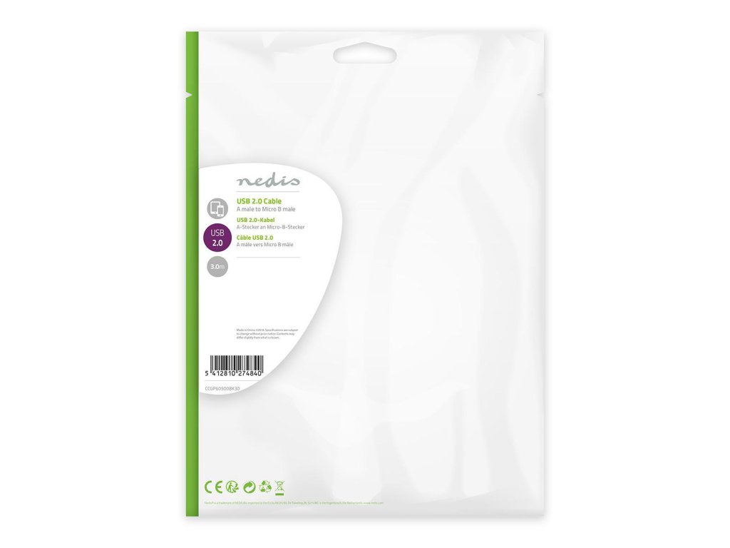 Nedis® standardní propojovací kabel zástrčka USB 2.0 A - zástrčka USB micro B pro přenos dat rychlostí 480 Mbps. Kabel je vhodný také pro spolehlivé nabíjení připojených přístrojů. Délka 3 m.