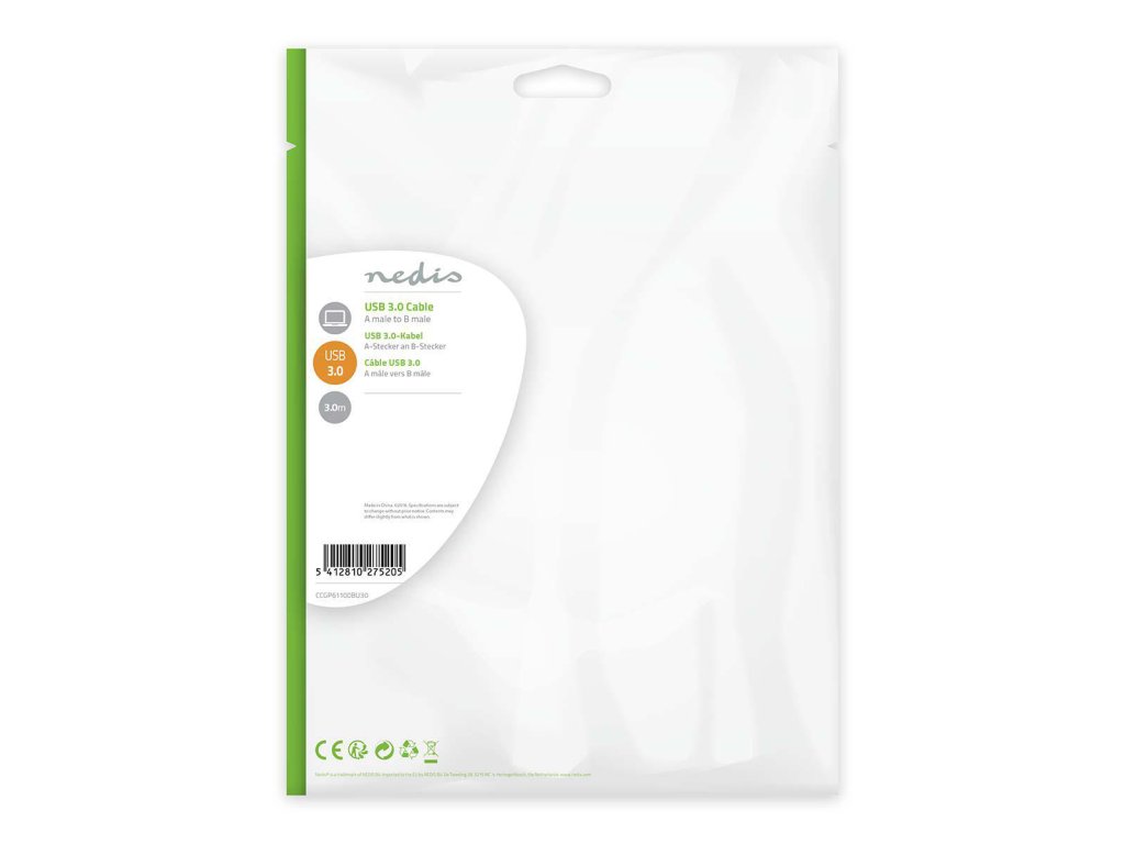 Nedis® kvalitní propojovací kabel USB 2.0 zástrčka USB A - zástrčka USB B pro vysokorychlostní přenos dat rychlostí 5 Gbps. Kabel je vhodný pro připojení tiskárny, skeneru nebo pevného disku k počítači. Délka 3 m.