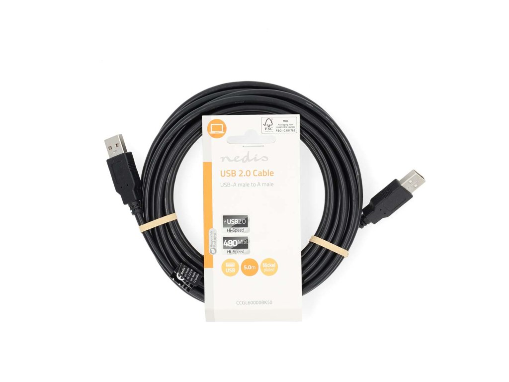 Nedis® kvalitní propojovací kabel zástrčka USB 2.0 A - zástrčka USB 2.0 A pro přenos dat rychlostí 480 Mbps. Délka 5 m.