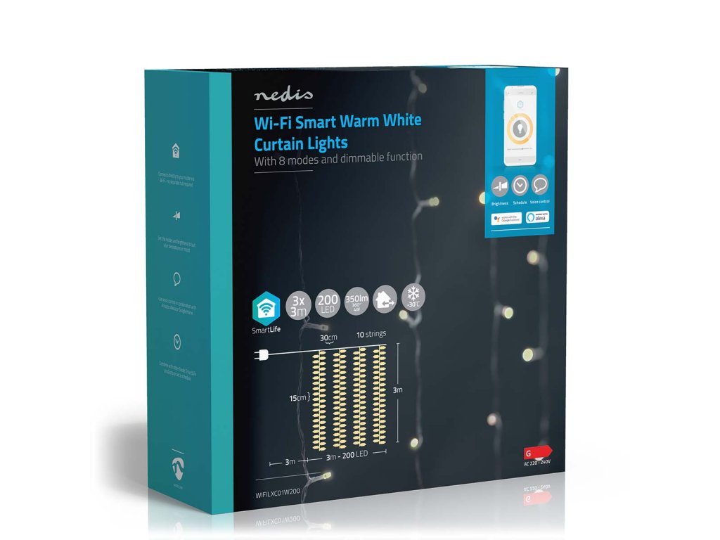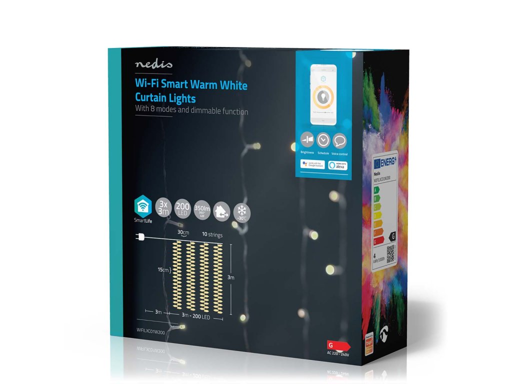 Tento Nedis® chytrý Wi-Fi světelný závěs 3 x 3 m je osazen celkem 200 LED diodami teplé bílé barvy v rastru 10 x 20 ks.