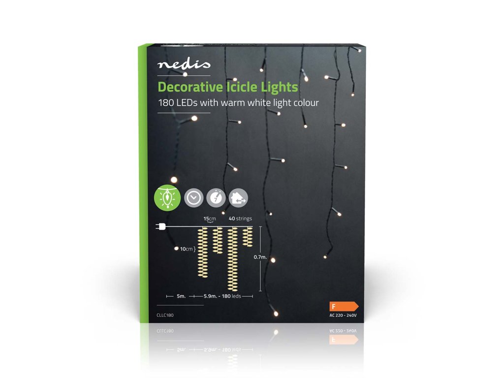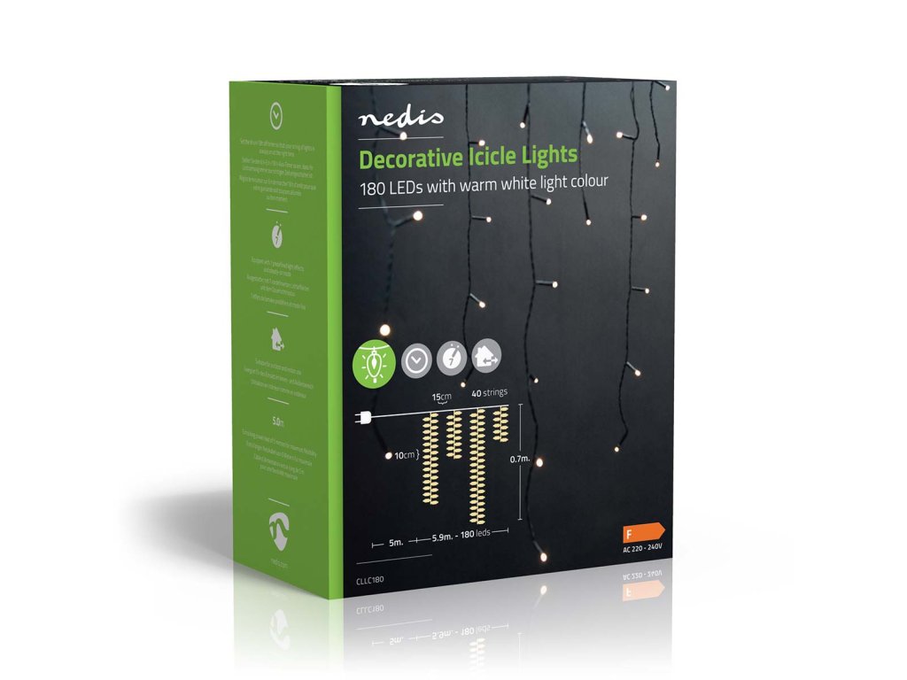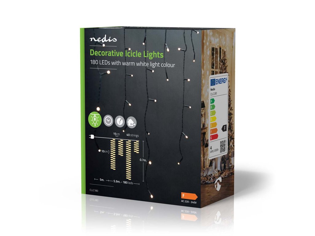 Nedis vánoční řetěz rampouchy, 180 LED, 7 funkcí, 5.9 m, vnitřní/venkovní IP44, teplá bílá (CLLC180)