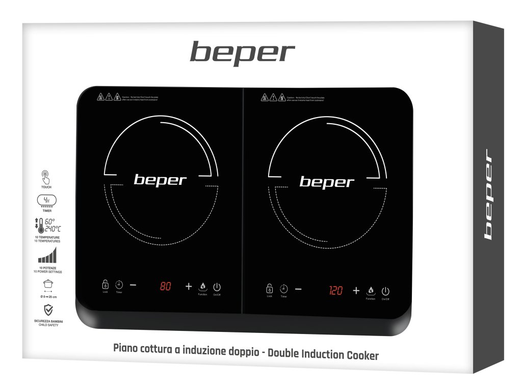 Dvouplotýnkový indukční vařič Beper BF720 s odolným povrchem proti poškrábání je ideálním řešením pro vaření s nádobím o průměru 8 až 25 cm. Každá varná plocha je vybavena vlastním dotykovým panelem s tlačítky pro nastavení úrovně výkonu, teploty a časovače pro odložení vypnutí vařiče od 10 minut do 4 hodin. Praktický a bezpečný, varná plocha se aktivuje pouze v přítomnosti nádobí a okolní povrch zůstává chladný. Dále je vařič vybaven dětskou pojistkou, funkcí automatického vypnutí a ochranou proti přehřátí. Sklokeramický povrch umožňuje snadnou údržbu a čištění.