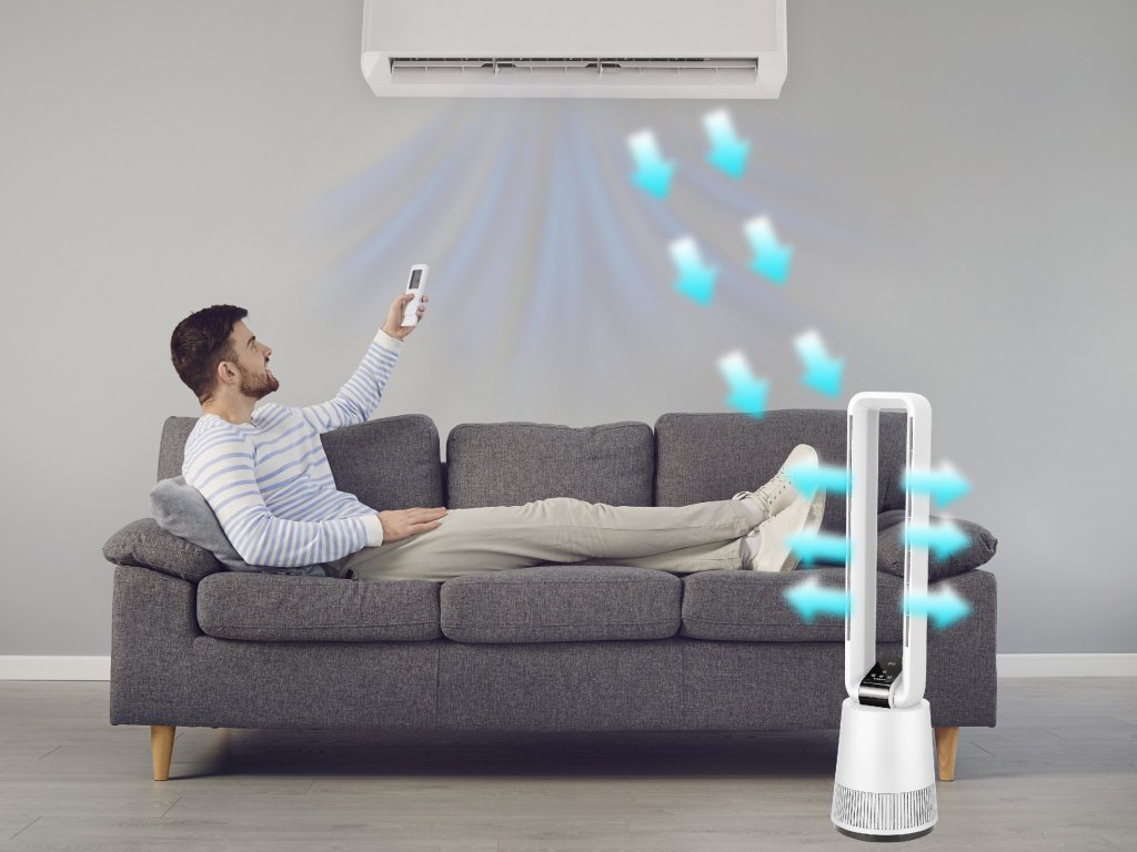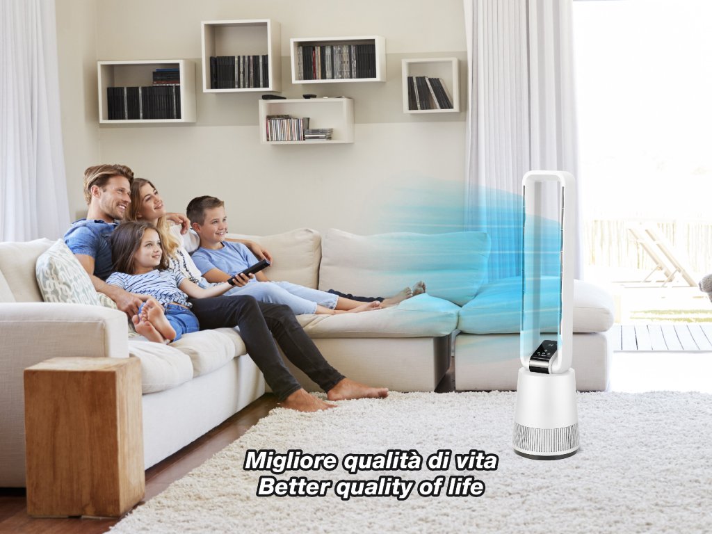 - Moderní sloupový ventilátor v elegantním bílém provedení