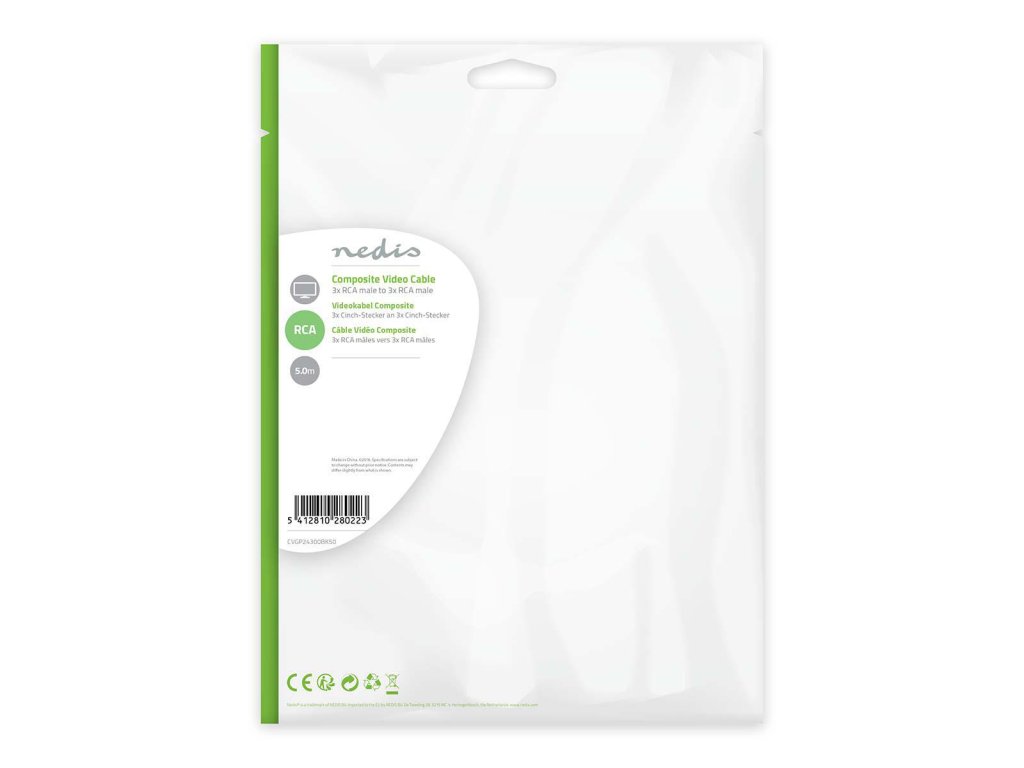 Nedis® propojovací audio/video kompozitní kabel s konektory 3 x CINCH (RCA) zástrčka na 3 x CINCH (RCA) zástrčka. Vhodný např. pro připojení videorekordéru nebo set-top boxu k televizoru. Délka 5 m.