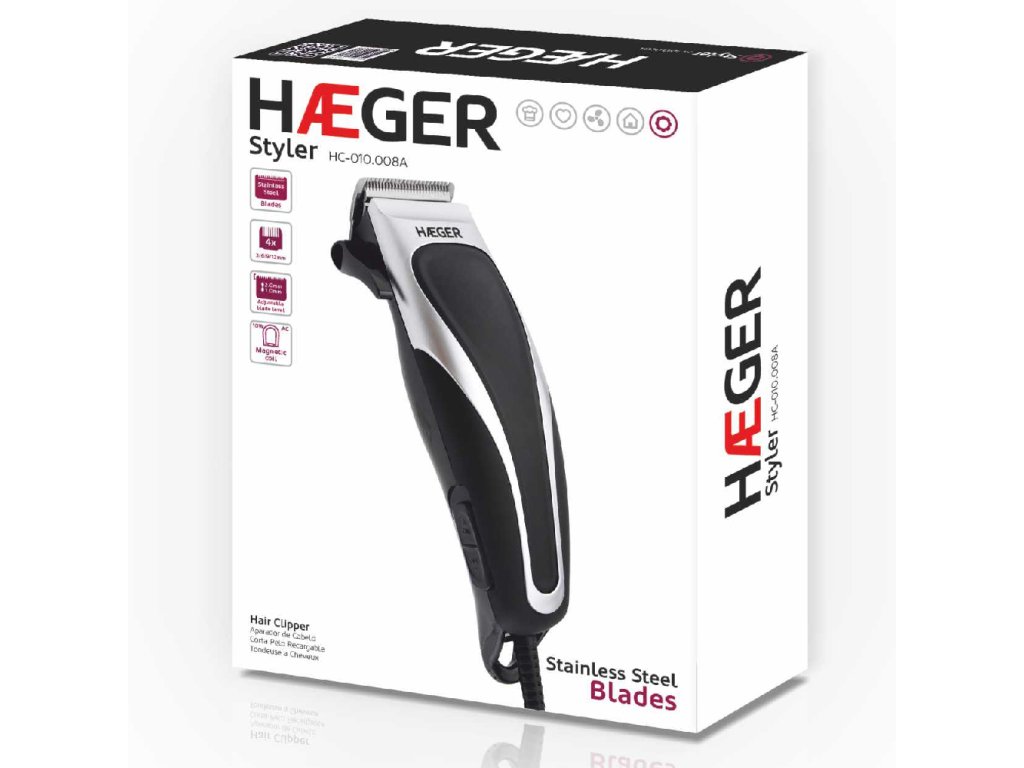 HAEGER zastřihovač vlasů STYLER se dodává s čepelemi z nerezové oceli, je ergonomický a praktický, má nastavitelnou úroveň čepele se 4 hřebeny (3 mm, 6 mm, 9 mm a 12 mm).