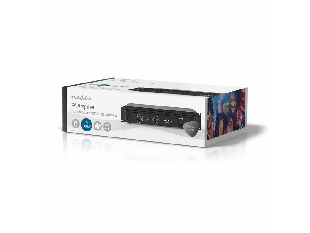 Poloprofesionální PA zesilovač Nedis® 2x 300W s možností montáže do skříní 19”. Ideální pro začínající diskžokeje, kteří vyžadují vysokou spolehlivost. Zabudovaný chladič s ventilátorem, konektory SPK, XLR se zámkem a rychlosvorky.